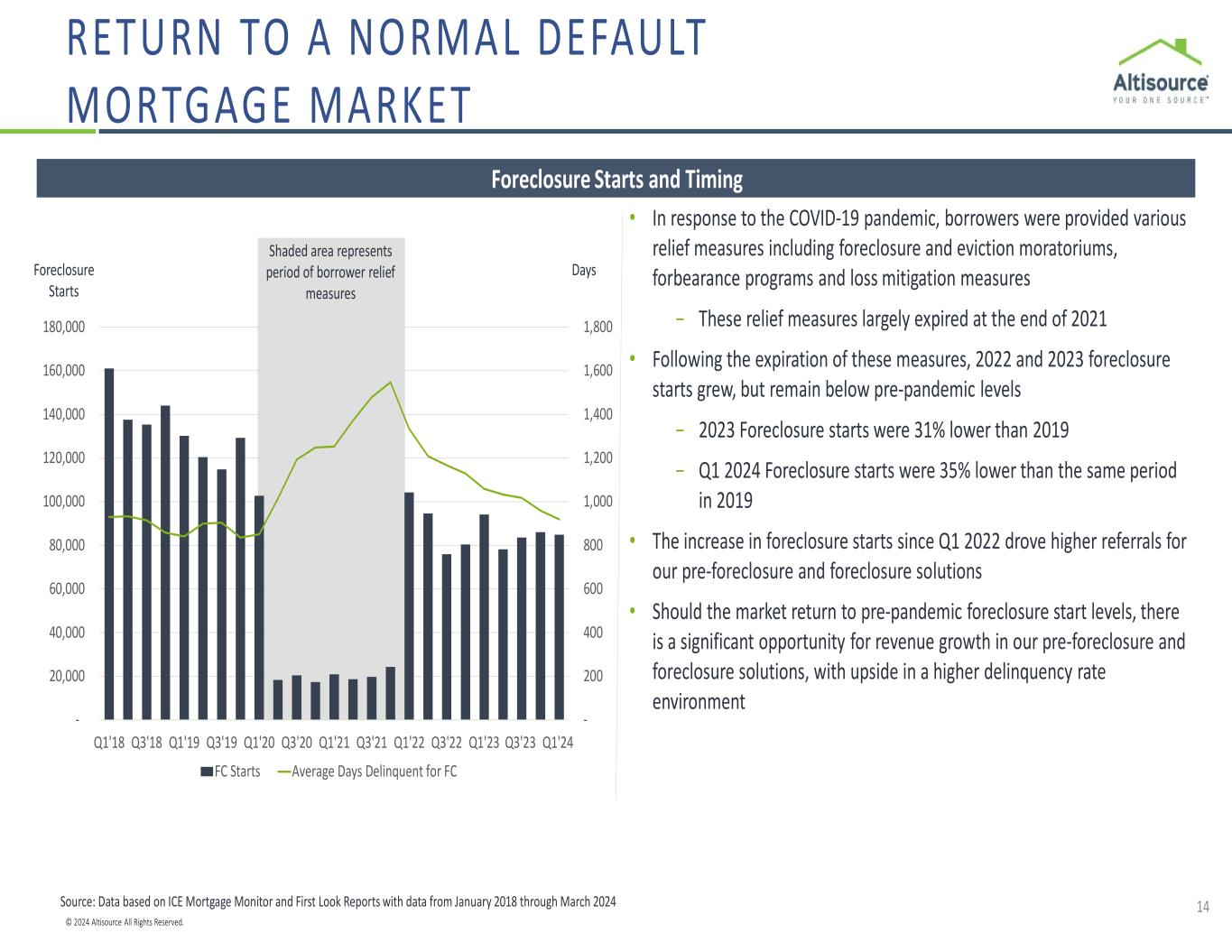 © 2024 Altisource All Rights Reserved. • The Run-Rate Case expands on the Scenario on page 12 and assumes the default market returns to a normal, pre-pandemic foreclosure environment • Default Service revenue – Ocwen-serviced loans: − Service revenue per delinquent loan for Ocwen-serviced non-GSE loans increases to $1,700 per delinquent loan2 from $1,264 (Q1’24 annualized) − Service revenue per delinquent loan for Ocwen-serviced GSE and FHA loans increases to $1,100 per delinquent loan3 from $700 (Q1’24 annualized) − Average delinquency rates for Ocwen-serviced portfolios increase to approximately Q4’19 levels − Existing Ocwen-serviced non-GSE loan portfolios (loan count) decline 10% per year for three years − Existing Ocwen-serviced GSE and FHA loan portfolio acquisitions (net of run-off) increase by 5% per year for three years • Default and non-default Service revenue – Non-Ocwen and Non-Rithm customers: − Total number of U.S. mortgages remains flat at March 2024 levels − Percentage of seriously delinquent loans generally consistent with 2018 market levels − Service revenue per active foreclosure based on 2019 levels and market share consistent with Q1’24 (and excludes growth in market share from fully ramped sales wins described on page 12) • Origination market remains the same as Q1’24 • Adjusted EBITDA1 margins on incremental default and non-default Service revenue of 40% • Actual results could differ materially Service Revenue – Run-Rate Case Run-Rate Case Assumptions Adjusted EBITDA1 – Run-Rate Case Financial Scenario (from page 12) RETURN TO A NORMAL DEFAULT MORTGAGE MARKET 13 Note: Dollars in millions 1 This is a non-GAAP measure reconciled and calculated in the Appendix. For a definition of Adjusted EBITDA, see page 23 2 Based on actual 2019 of $3,058, adjusted down for the estimated field services, valuation and title referrals associated with Rithm’s portfolios that it redirected to its vendor subsidiaries 3 Based on actual 2019 of $277, adjusted upward to reflect our May 2021 expanded relationship with Ocwen Financial Corporation to include estimated normalized field services and Hubzu referrals revenue from FHA, VA and USDA portfolios Incremental Service revenue, net of run-off and churn Run-Rate Case Service revenue Incremental Adjusted EBITDA1 Run-Rate Case Adjusted EBITDA1 Financial Scenario (from page 12)