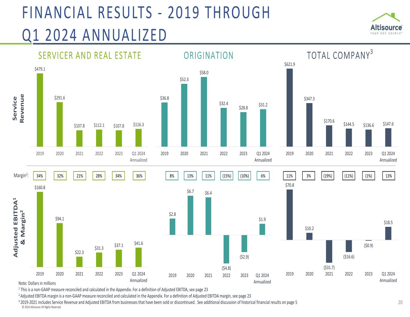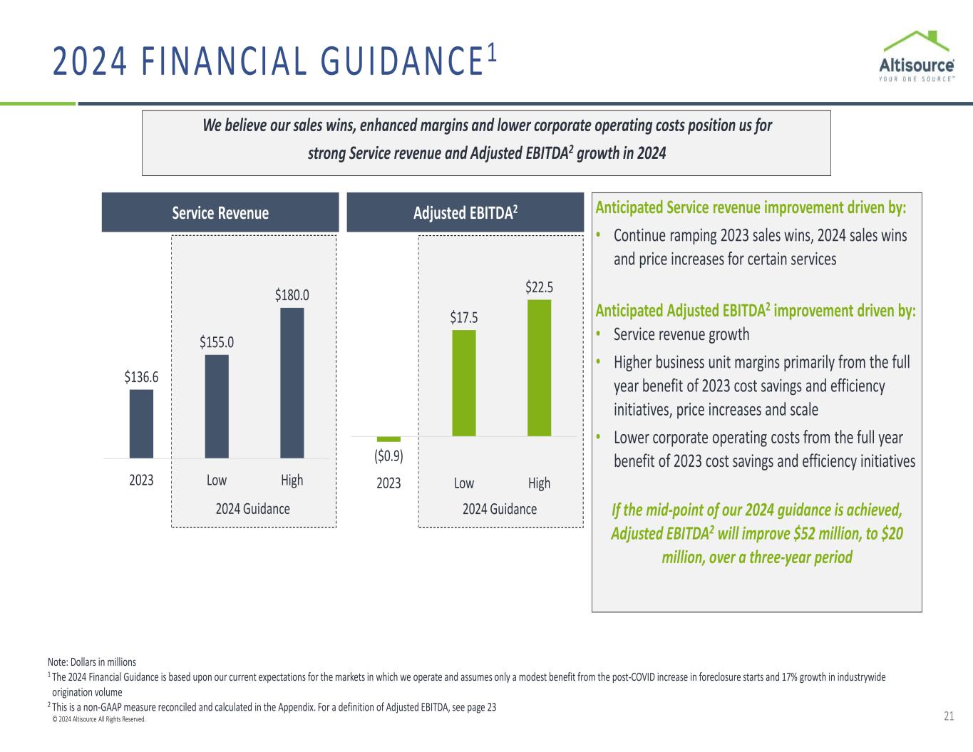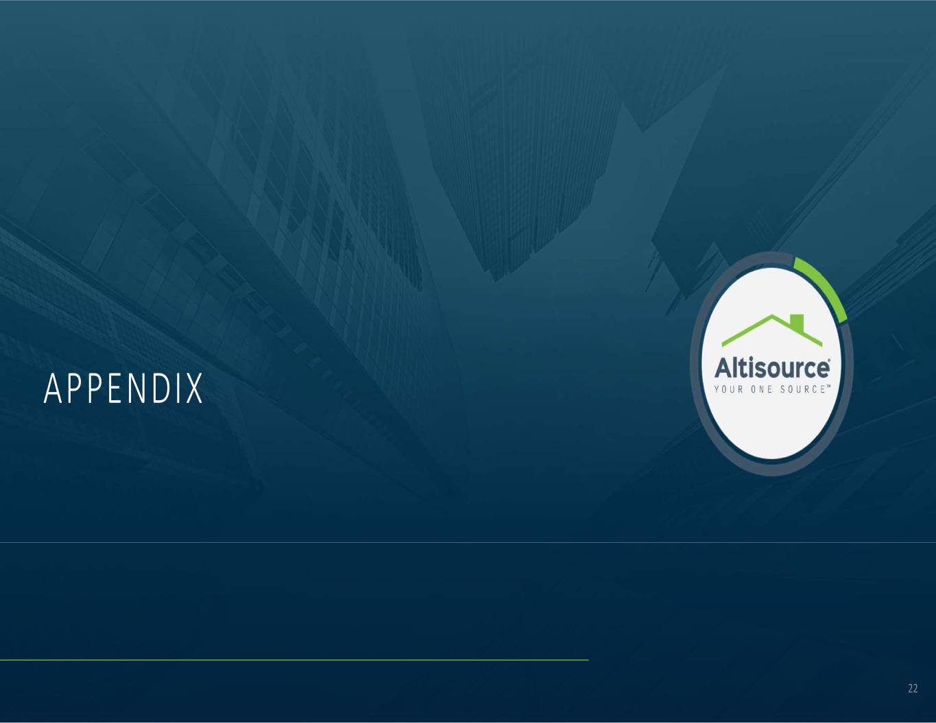 © 2024 Altisource All Rights Reserved. 20 Note: Dollars in millions 1 This is a non-GAAP measure reconciled and calculated in the Appendix. For a definition of Adjusted EBITDA, see page 23 2 Adjusted EBITDA margin is a non-GAAP measure reconciled and calculated in the Appendix. For a definition of Adjusted EBITDA margin, see page 23 3 2019-2021 includes Service Revenue and Adjusted EBITDA from businesses that have been sold or discontinued. See additional discussion of historical financial results on page 5 ORIGINATIONSERVICER AND REAL ESTATE Se rv ic e Re ve nu e TOTAL COMPANY3 Ad ju st ed E BI TD A1 & M ar gi n2 $479.1 $291.6 $107.8 $112.1 $107.8 $116.3 2019 2020 2021 2022 2023 Q1 2024 Annualized $160.8 $94.1 $22.3 $31.3 $37.1 $41.6 2019 2020 2021 2022 2023 Q1 2024 Annualized $36.8 $52.3 $58.0 $32.4 $28.8 $31.2 2019 2020 2021 2022 2023 Q1 2024 Annualized $2.8 $6.7 $6.4 ($4.8) ($2.9) $1.9 2019 2020 2021 2022 2023 Q1 2024 Annualized $621.9 $347.3 $170.6 $144.5 $136.6 $147.6 2019 2020 2021 2022 2023 Q1 2024 Annualized $70.8 $10.2 ($31.7) ($16.6) ($0.9) $18.5 2019 2020 2021 2022 2023 Q1 2024 Annualized Margin2: 34% 32% 21% 28% 8% 13% 11% (15%) 11% 3% (19%) (11%)34% (10%) (1%)36% 6% 13% F INANCIAL RESULTS - 2019 THROUGH Q1 2024 ANNUALIZED