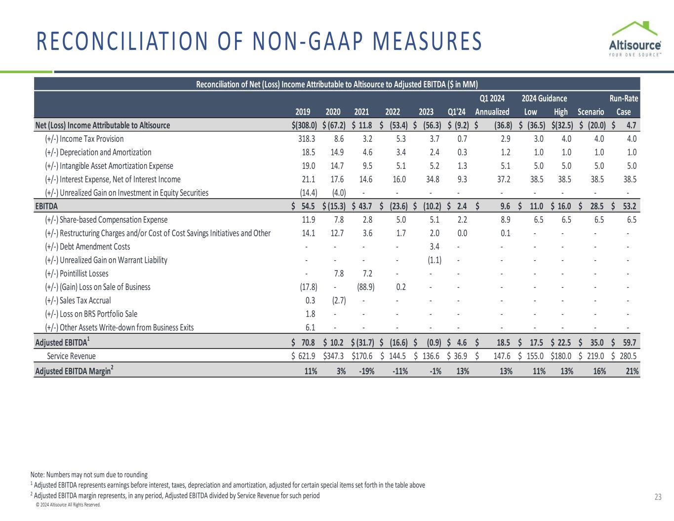 © 2024 Altisource All Rights Reserved. RECONCIL IATION OF NON-GAAP MEASURES 23 Note: Numbers may not sum due to rounding 1 Adjusted EBITDA represents earnings before interest, taxes, depreciation and amortization, adjusted for certain special items set forth in the table above 2 Adjusted EBITDA margin represents, in any period, Adjusted EBITDA divided by Service Revenue for such period Q1 2024 Run-Rate 2019 2020 2021 2022 2023 Q1'24 Annualized Low High Scenario Case Net (Loss) Income Attributable to Altisource (308.0)$ (67.2)$ 11.8$ (53.4)$ (56.3)$ (9.2)$ (36.8)$ (36.5)$ (32.5)$ (20.0)$ 4.7$ (+/-) Income Tax Provision 318.3 8.6 3.2 5.3 3.7 0.7 2.9 3.0 4.0 4.0 4.0 (+/-) Depreciation and Amortization 18.5 14.9 4.6 3.4 2.4 0.3 1.2 1.0 1.0 1.0 1.0 (+/-) Intangible Asset Amortization Expense 19.0 14.7 9.5 5.1 5.2 1.3 5.1 5.0 5.0 5.0 5.0 (+/-) Interest Expense, Net of Interest Income 21.1 17.6 14.6 16.0 34.8 9.3 37.2 38.5 38.5 38.5 38.5 (+/-) Unrealized Gain on Investment in Equity Securities (14.4) (4.0) - - - - - - - - - EBITDA 54.5$ (15.3)$ 43.7$ (23.6)$ (10.2)$ 2.4$ 9.6$ 11.0$ 16.0$ 28.5$ 53.2$ (+/-) Share-based Compensation Expense 11.9 7.8 2.8 5.0 5.1 2.2 8.9 6.5 6.5 6.5 6.5 (+/-) Restructuring Charges and/or Cost of Cost Savings Initiatives and Other 14.1 12.7 3.6 1.7 2.0 0.0 0.1 - - - - (+/-) Debt Amendment Costs - - - - 3.4 - - - - - - (+/-) Unrealized Gain on Warrant Liability - - - - (1.1) - - - - - - (+/-) Pointillist Losses - 7.8 7.2 - - - - - - - - (+/-) (Gain) Loss on Sale of Business (17.8) - (88.9) 0.2 - - - - - - - (+/-) Sales Tax Accrual 0.3 (2.7) - - - - - - - - - (+/-) Loss on BRS Portfolio Sale 1.8 - - - - - - - - - - (+/-) Other Assets Write-down from Business Exits 6.1 - - - - - - - - - - Adjusted EBITDA1 70.8$ 10.2$ (31.7)$ (16.6)$ (0.9)$ 4.6$ 18.5$ 17.5$ 22.5$ 35.0$ 59.7$ Service Revenue 621.9$ 347.3$ 170.6$ 144.5$ 136.6$ 36.9$ 147.6$ 155.0$ 180.0$ 219.0$ 280.5$ Adjusted EBITDA Margin2 11% 3% -19% -11% -1% 13% 13% 11% 13% 16% 21% Reconciliation of Net (Loss) Income Attributable to Altisource to Adjusted EBITDA ($ in MM) 2024 Guidance
