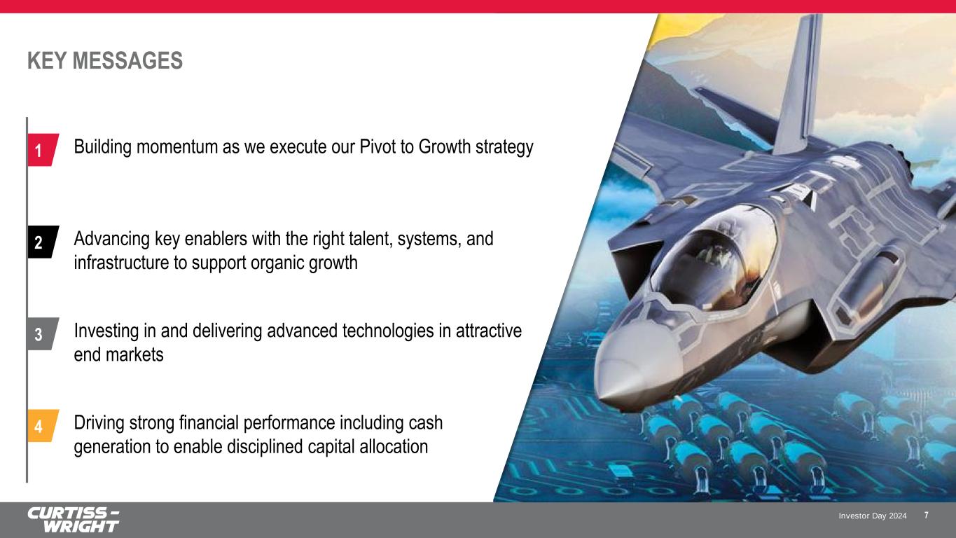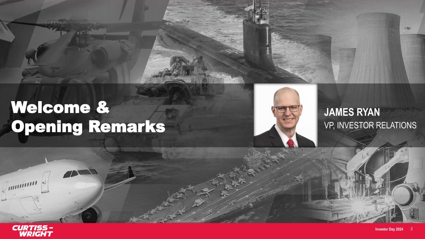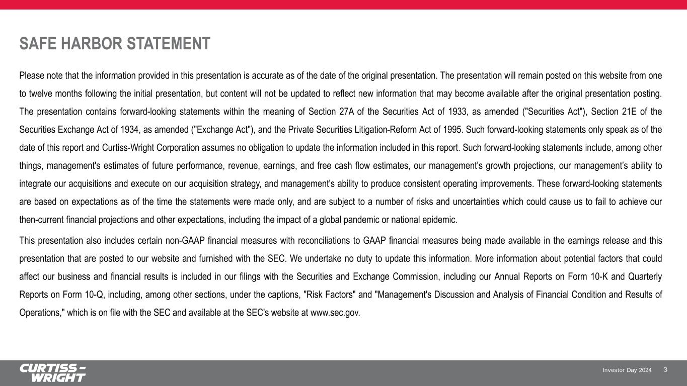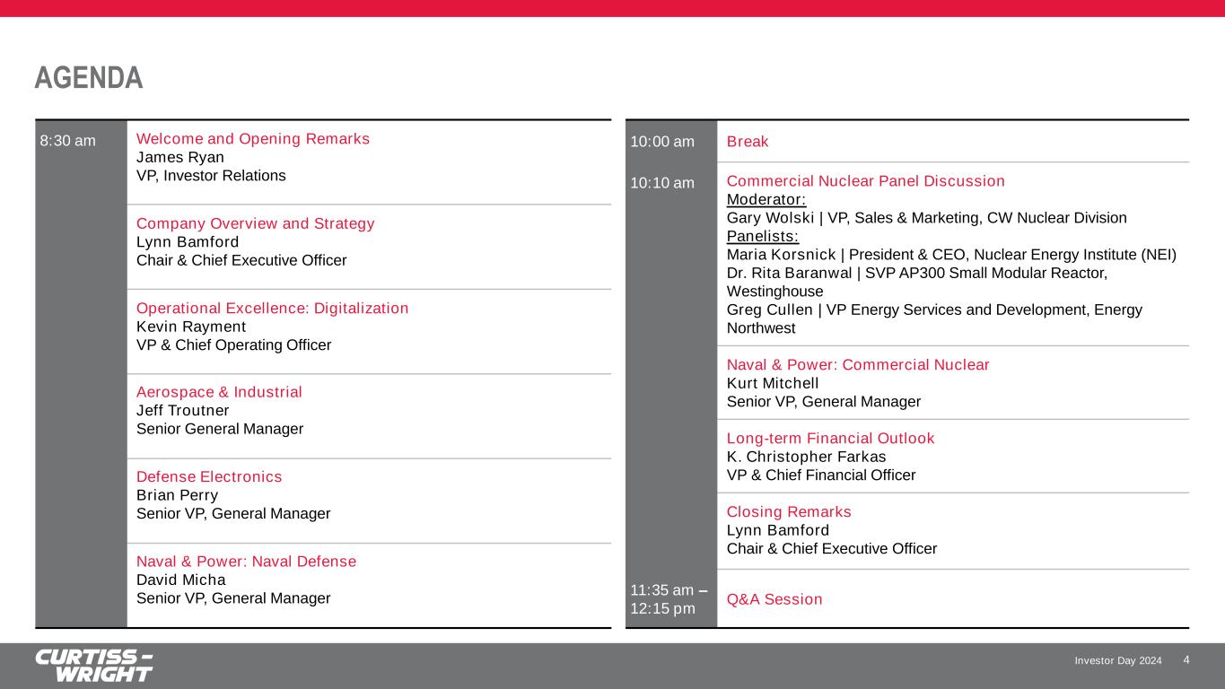 Investor Day 2024 SAFE HARBOR STATEMENT Please note that the information provided in this presentation is accurate as of the date of the original presentation. The presentation will remain posted on this website from one to twelve months following the initial presentation, but content will not be updated to reflect new information that may become available after the original presentation posting. The presentation contains forward-looking statements within the meaning of Section 27A of the Securities Act of 1933, as amended ("Securities Act"), Section 21E of the Securities Exchange Act of 1934, as amended ("Exchange Act"), and the Private Securities Litigation Reform Act of 1995. Such forward-looking statements only speak as of the date of this report and Curtiss-Wright Corporation assumes no obligation to update the information included in this report. Such forward-looking statements include, among other things, management's estimates of future performance, revenue, earnings, and free cash flow estimates, our management's growth projections, our management’s ability to integrate our acquisitions and execute on our acquisition strategy, and management's ability to produce consistent operating improvements. These forward-looking statements are based on expectations as of the time the statements were made only, and are subject to a number of risks and uncertainties which could cause us to fail to achieve our then-current financial projections and other expectations, including the impact of a global pandemic or national epidemic. This presentation also includes certain non-GAAP financial measures with reconciliations to GAAP financial measures being made available in the earnings release and this presentation that are posted to our website and furnished with the SEC. We undertake no duty to update this information. More information about potential factors that could affect our business and financial results is included in our filings with the Securities and Exchange Commission, including our Annual Reports on Form 10-K and Quarterly Reports on Form 10-Q, including, among other sections, under the captions, "Risk Factors" and "Management's Discussion and Analysis of Financial Condition and Results of Operations," which is on file with the SEC and available at the SEC's website at www.sec.gov. 3