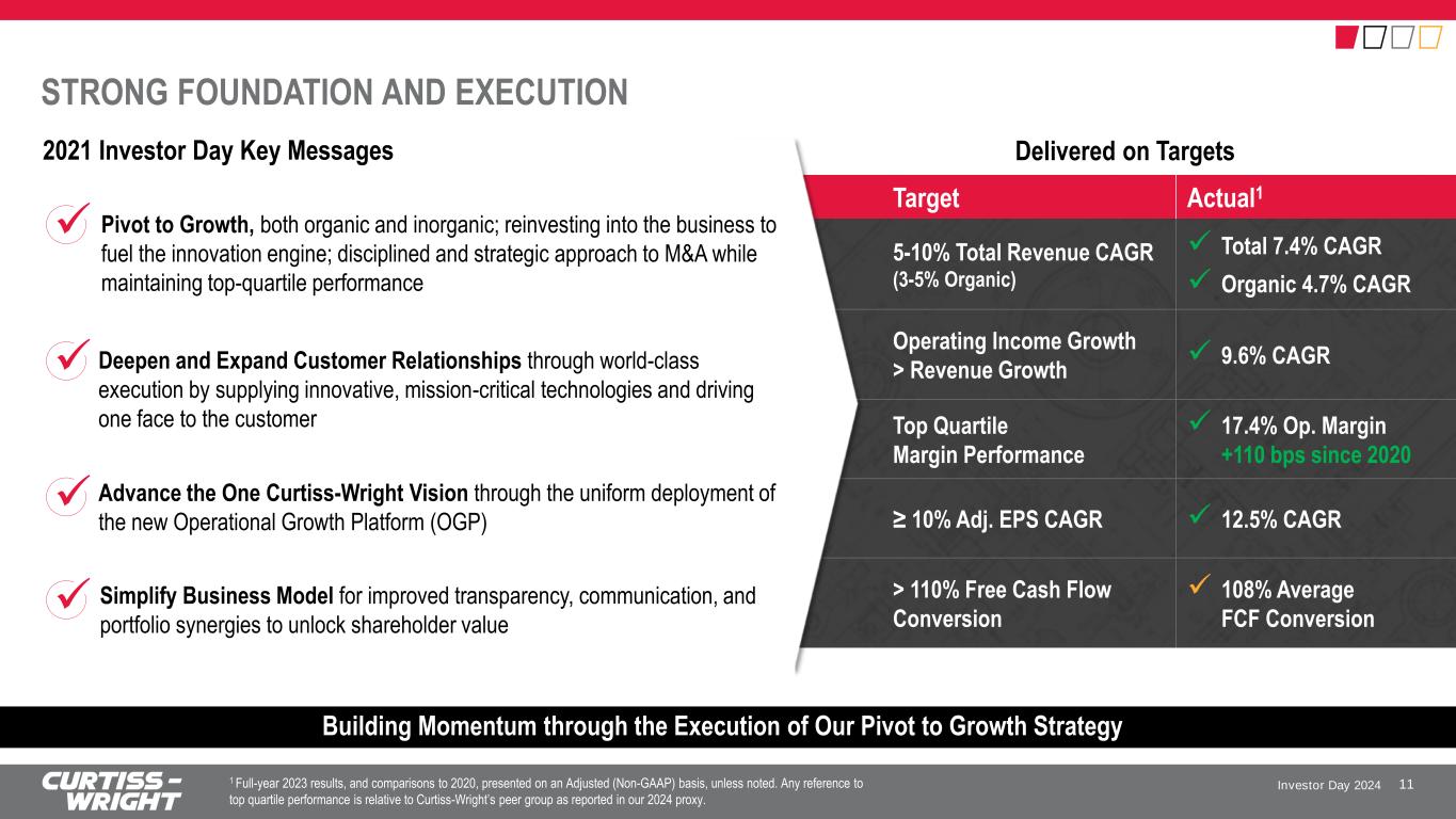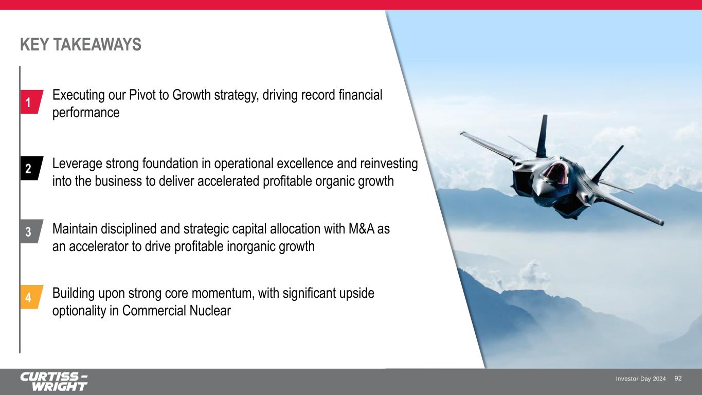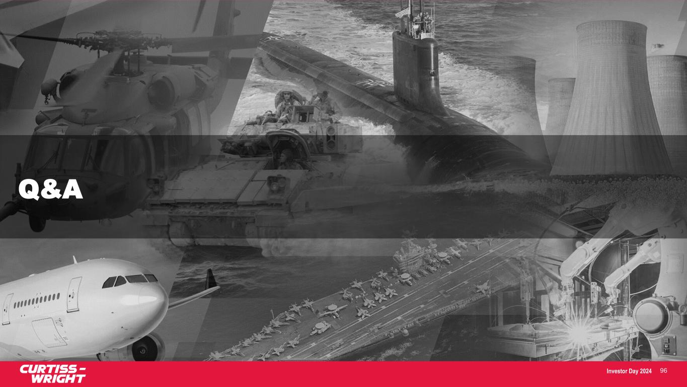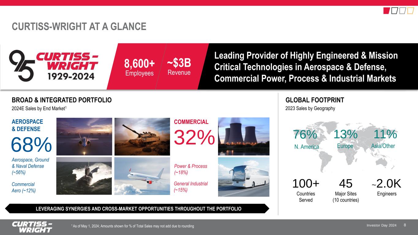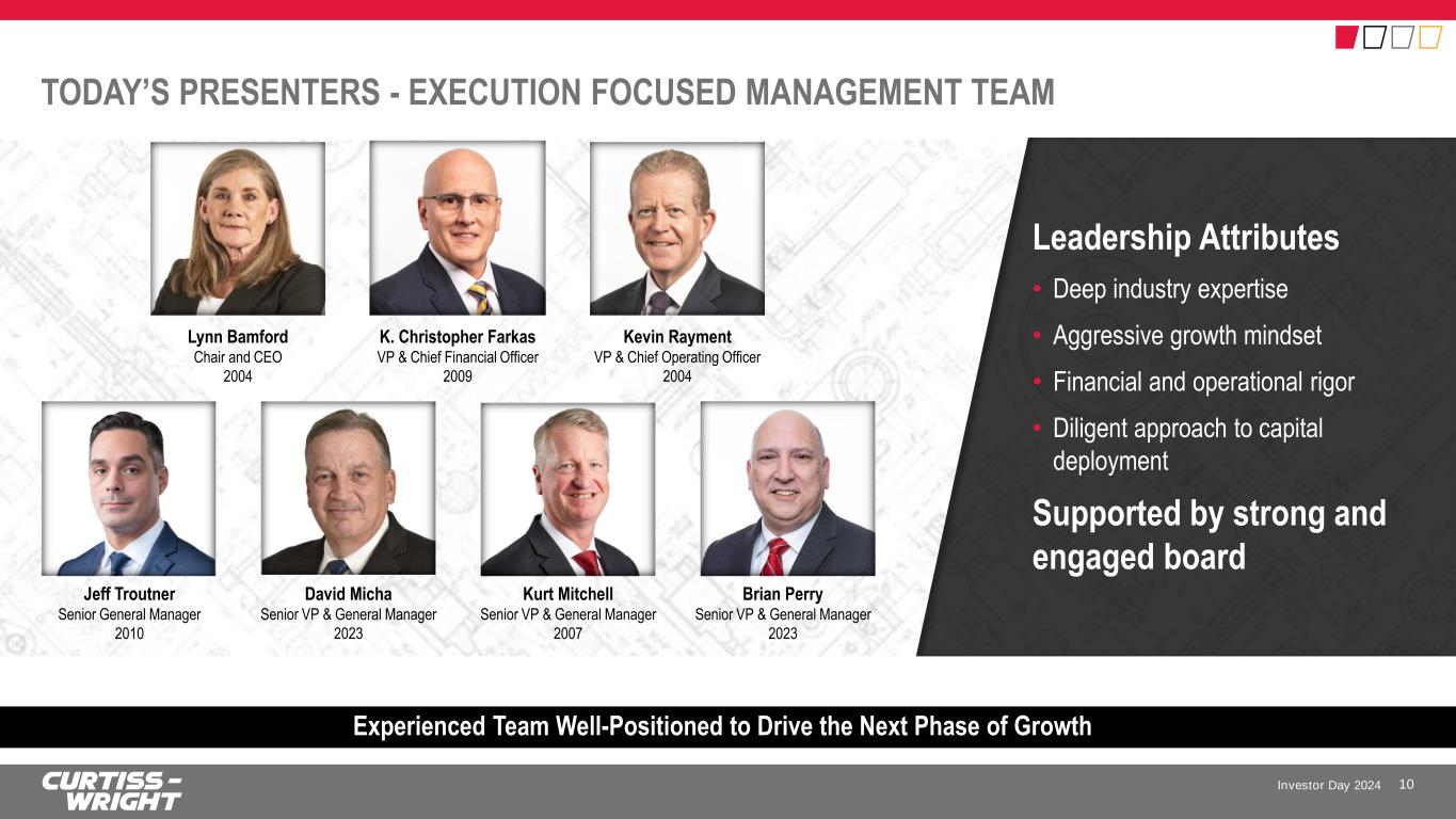 Investor Day 2024 SAFE HARBOR STATEMENT Please note that the information provided in this presentation is accurate as of the date of the original presentation. The presentation will remain posted on this website from one to twelve months following the initial presentation, but content will not be updated to reflect new information that may become available after the original presentation posting. The presentation contains forward-looking statements within the meaning of Section 27A of the Securities Act of 1933, as amended ("Securities Act"), Section 21E of the Securities Exchange Act of 1934, as amended ("Exchange Act"), and the Private Securities Litigation Reform Act of 1995. Such forward-looking statements only speak as of the date of this report and Curtiss-Wright Corporation assumes no obligation to update the information included in this report. Such forward-looking statements include, among other things, management's estimates of future performance, revenue, earnings, and free cash flow estimates, our management's growth projections, our management’s ability to integrate our acquisitions and execute on our acquisition strategy, and management's ability to produce consistent operating improvements. These forward-looking statements are based on expectations as of the time the statements were made only, and are subject to a number of risks and uncertainties which could cause us to fail to achieve our then-current financial projections and other expectations, including the impact of a global pandemic or national epidemic. This presentation also includes certain non-GAAP financial measures with reconciliations to GAAP financial measures being made available in the earnings release and this presentation that are posted to our website and furnished with the SEC. We undertake no duty to update this information. More information about potential factors that could affect our business and financial results is included in our filings with the Securities and Exchange Commission, including our Annual Reports on Form 10-K and Quarterly Reports on Form 10-Q, including, among other sections, under the captions, "Risk Factors" and "Management's Discussion and Analysis of Financial Condition and Results of Operations," which is on file with the SEC and available at the SEC's website at www.sec.gov. 3