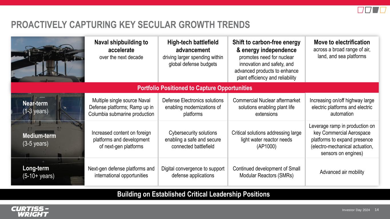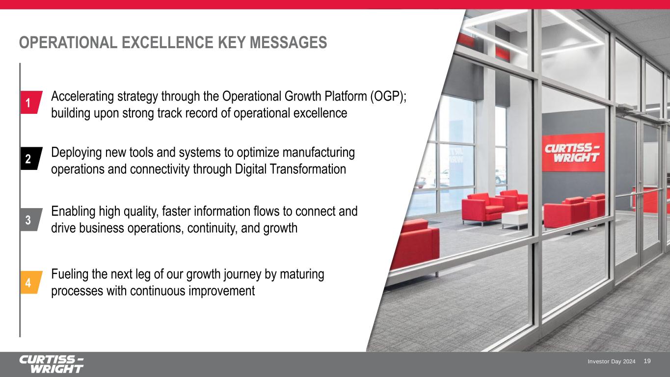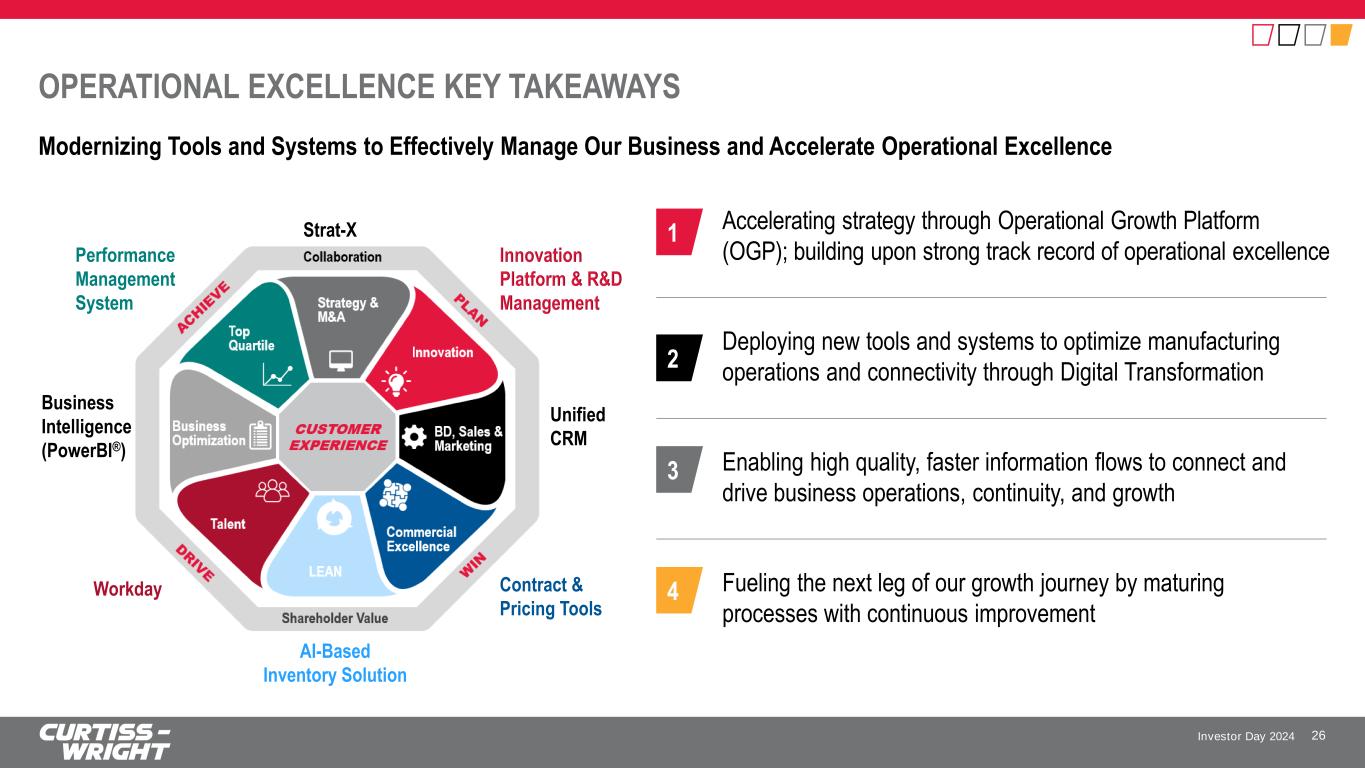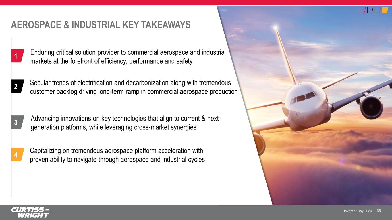 Investor Day 2024 SAFE HARBOR STATEMENT Please note that the information provided in this presentation is accurate as of the date of the original presentation. The presentation will remain posted on this website from one to twelve months following the initial presentation, but content will not be updated to reflect new information that may become available after the original presentation posting. The presentation contains forward-looking statements within the meaning of Section 27A of the Securities Act of 1933, as amended ("Securities Act"), Section 21E of the Securities Exchange Act of 1934, as amended ("Exchange Act"), and the Private Securities Litigation Reform Act of 1995. Such forward-looking statements only speak as of the date of this report and Curtiss-Wright Corporation assumes no obligation to update the information included in this report. Such forward-looking statements include, among other things, management's estimates of future performance, revenue, earnings, and free cash flow estimates, our management's growth projections, our management’s ability to integrate our acquisitions and execute on our acquisition strategy, and management's ability to produce consistent operating improvements. These forward-looking statements are based on expectations as of the time the statements were made only, and are subject to a number of risks and uncertainties which could cause us to fail to achieve our then-current financial projections and other expectations, including the impact of a global pandemic or national epidemic. This presentation also includes certain non-GAAP financial measures with reconciliations to GAAP financial measures being made available in the earnings release and this presentation that are posted to our website and furnished with the SEC. We undertake no duty to update this information. More information about potential factors that could affect our business and financial results is included in our filings with the Securities and Exchange Commission, including our Annual Reports on Form 10-K and Quarterly Reports on Form 10-Q, including, among other sections, under the captions, "Risk Factors" and "Management's Discussion and Analysis of Financial Condition and Results of Operations," which is on file with the SEC and available at the SEC's website at www.sec.gov. 3