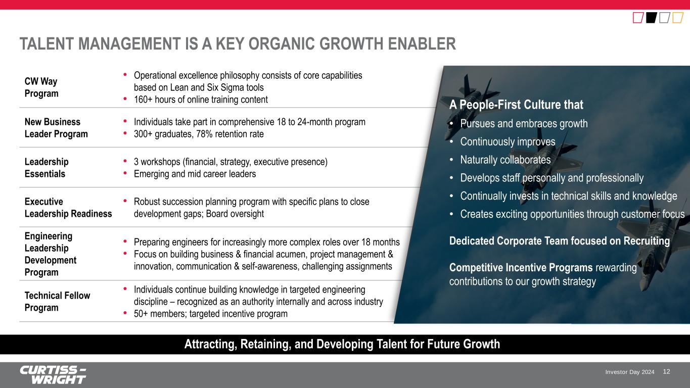 Investor Day 2024 Target Actual1 5-10% Total Revenue CAGR (3-5% Organic) ✓ Total 7.4% CAGR ✓ Organic 4.7% CAGR Operating Income Growth > Revenue Growth ✓ 9.6% CAGR Top Quartile Margin Performance ✓ 17.4% Op. Margin +110 bps since 2020 ≥ 10% Adj. EPS CAGR ✓ 12.5% CAGR > 110% Free Cash Flow Conversion ✓ 108% Average FCF Conversion STRONG FOUNDATION AND EXECUTION 11 Building Momentum through the Execution of Our Pivot to Growth Strategy 2021 Investor Day Key Messages Delivered on Targets Pivot to Growth, both organic and inorganic; reinvesting into the business to fuel the innovation engine; disciplined and strategic approach to M&A while maintaining top-quartile performance ✓ Deepen and Expand Customer Relationships through world-class execution by supplying innovative, mission-critical technologies and driving one face to the customer ✓ Advance the One Curtiss-Wright Vision through the uniform deployment of the new Operational Growth Platform (OGP) ✓ Simplify Business Model for improved transparency, communication, and portfolio synergies to unlock shareholder value ✓ 1 Full-year 2023 results, and comparisons to 2020, presented on an Adjusted (Non-GAAP) basis, unless noted. Any reference to top quartile performance is relative to Curtiss-Wright’s peer group as reported in our 2024 proxy.