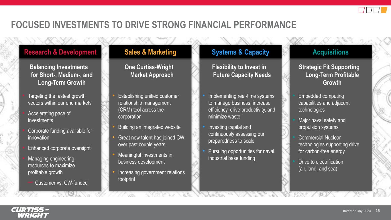 Investor Day 2024 PROACTIVELY CAPTURING KEY SECULAR GROWTH TRENDS 14 Building on Established Critical Leadership Positions Naval shipbuilding to accelerate over the next decade High-tech battlefield advancement driving larger spending within global defense budgets Shift to carbon-free energy & energy independence promotes need for nuclear innovation and safety, and advanced products to enhance plant efficiency and reliability Move to electrification across a broad range of air, land, and sea platforms Portfolio Positioned to Capture Opportunities Near-term (1-3 years) Multiple single source Naval Defense platforms; Ramp up in Columbia submarine production Defense Electronics solutions enabling modernizations of platforms Commercial Nuclear aftermarket solutions enabling plant life extensions Increasing on/off highway large electric platforms and electric automation Medium-term (3-5 years) Increased content on foreign platforms and development of next-gen platforms Cybersecurity solutions enabling a safe and secure connected battlefield Critical solutions addressing large light water reactor needs (AP1000) Leverage ramp in production on key Commercial Aerospace platforms to expand presence (electro-mechanical actuation, sensors on engines) Long-term (5-10+ years) Next-gen defense platforms and international opportunities Digital convergence to support defense applications Continued development of Small Modular Reactors (SMRs) Advanced air mobility