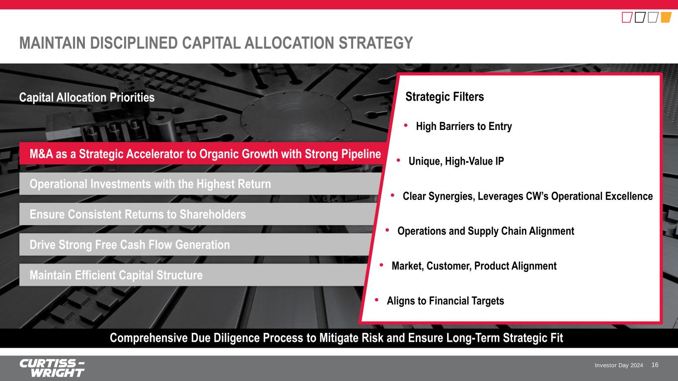 Investor Day 2024 FOCUSED INVESTMENTS TO DRIVE STRONG FINANCIAL PERFORMANCE Flexibility to Invest in Future Capacity Needs • Implementing real-time systems to manage business, increase efficiency, drive productivity, and minimize waste • Investing capital and continuously assessing our preparedness to scale • Pursuing opportunities for naval industrial base funding One Curtiss-Wright Market Approach • Establishing unified customer relationship management (CRM) tool across the corporation • Building an integrated website • Great new talent has joined CW over past couple years • Meaningful investments in business development • Increasing government relations footprint Balancing Investments for Short-, Medium-, and Long-Term Growth • Targeting the fastest growth vectors within our end markets • Accelerating pace of investments • Corporate funding available for innovation • Enhanced corporate oversight • Managing engineering resources to maximize profitable growth ꟷ Customer vs. CW-funded 15 Research & Development Sales & Marketing Systems & Capacity Strategic Fit Supporting Long-Term Profitable Growth • Embedded computing capabilities and adjacent technologies • Major naval safety and propulsion systems • Commercial Nuclear technologies supporting drive for carbon-free energy • Drive to electrification (air, land, and sea) Acquisitions