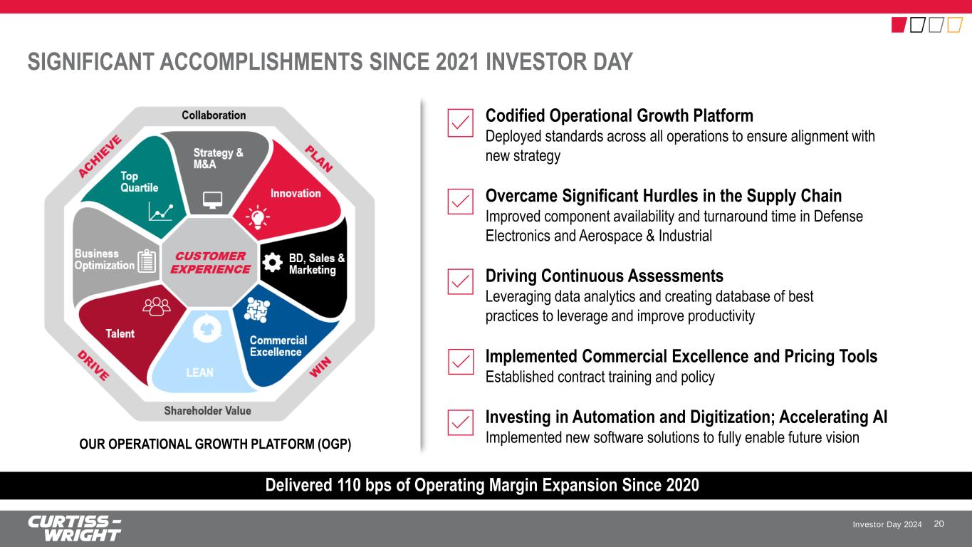 Investor Day 2024 OPERATIONAL EXCELLENCE KEY MESSAGES 19 4 1 2 3 Accelerating strategy through the Operational Growth Platform (OGP); building upon strong track record of operational excellence Fueling the next leg of our growth journey by maturing processes with continuous improvement Deploying new tools and systems to optimize manufacturing operations and connectivity through Digital Transformation Enabling high quality, faster information flows to connect and drive business operations, continuity, and growth