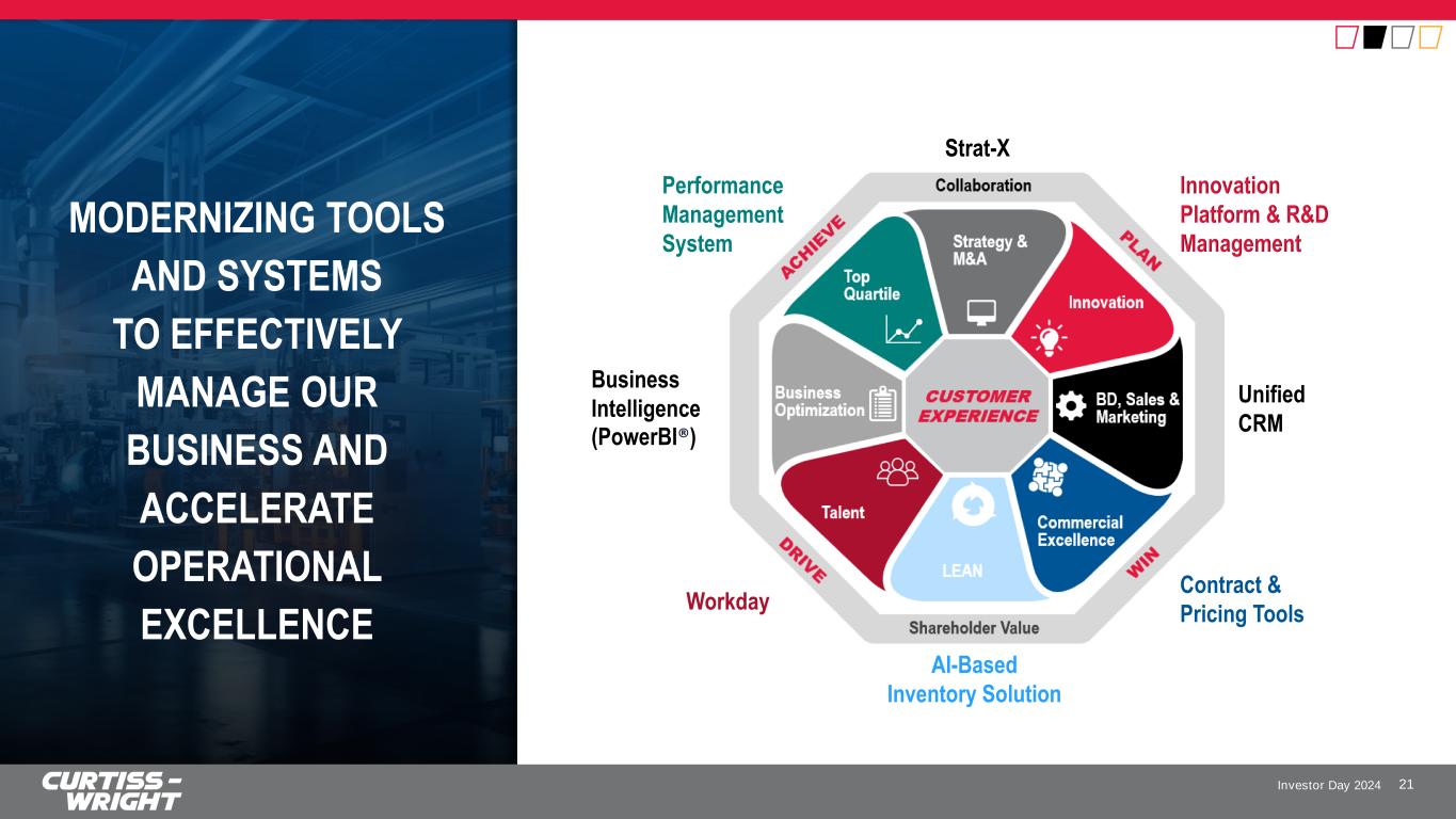 Investor Day 2024 SIGNIFICANT ACCOMPLISHMENTS SINCE 2021 INVESTOR DAY 20 Delivered 110 bps of Operating Margin Expansion Since 2020 OUR OPERATIONAL GROWTH PLATFORM (OGP) Codified Operational Growth Platform Deployed standards across all operations to ensure alignment with new strategy Overcame Significant Hurdles in the Supply Chain Improved component availability and turnaround time in Defense Electronics and Aerospace & Industrial Driving Continuous Assessments Leveraging data analytics and creating database of best practices to leverage and improve productivity Implemented Commercial Excellence and Pricing Tools Established contract training and policy Investing in Automation and Digitization; Accelerating AI Implemented new software solutions to fully enable future vision