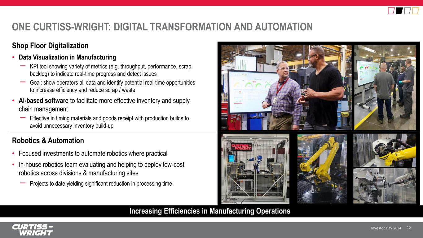 Investor Day 2024 ONE CURTISS-WRIGHT: DIGITAL TRANSFORMATION AND AUTOMATION 22 Increasing Efficiencies in Manufacturing Operations Shop Floor Digitalization • Data Visualization in Manufacturing ꟷ KPI tool showing variety of metrics (e.g. throughput, performance, scrap, backlog) to indicate real-time progress and detect issues ꟷ Goal: show operators all data and identify potential real-time opportunities to increase efficiency and reduce scrap / waste • AI-based software to facilitate more effective inventory and supply chain management ꟷ Effective in timing materials and goods receipt with production builds to avoid unnecessary inventory build-up Robotics & Automation • Focused investments to automate robotics where practical • In-house robotics team evaluating and helping to deploy low-cost robotics across divisions & manufacturing sites ꟷ Projects to date yielding significant reduction in processing time