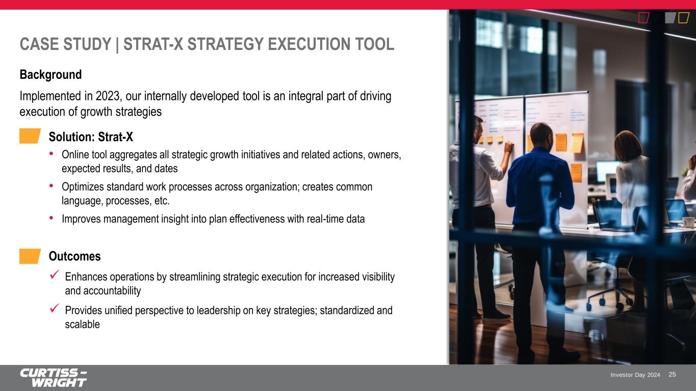 Investor Day 2024 CASE STUDY | ENABLING WORKFORCE MANAGEMENT Background Previously had 21 separate HR systems across the organization 24 Solution: Consolidated HR Systems • Implemented Workday - Reduced from 21 to 1 HR system • Common interface, implemented across global workforce • Comprehensive approach to workforce management and talent development • Develop improved understanding of business unit capacity needs Outcomes ✓ Enhanced workforce planning ✓ Improving employee experience ✓ Greater oversight of productivity ✓ Accelerating speed of information and common data flows What’s Next: Continue to Drive Workforce Development ✓ Developing a complete development tool, creating roadmap for managing Employment Development Life Cycle ✓ Onboarding early career and experienced professionals ✓ Creating role-specific curriculums across the organization to increase capabilities and retention ✓ Identifying early career high potentials earlier and advance their development