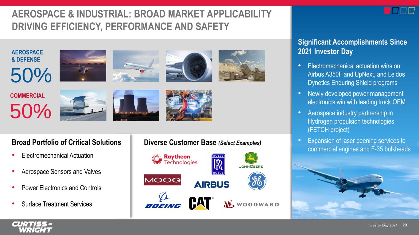 Investor Day 2024 4 2 3 AEROSPACE & INDUSTRIAL KEY MESSAGES 28 Legacy provider of critical solutions to the commercial aerospace and industrial markets at the forefront of efficiency, performance and safety Advancing innovations on key technologies that align to current & next- generation platforms, while leveraging cross-market synergies Secular trends of electrification and decarbonization along with tremendous customer backlog driving long-term ramp in commercial aerospace production 1 Capitalizing on tremendous aerospace platform acceleration with proven ability to navigate through aerospace and industrial cycles