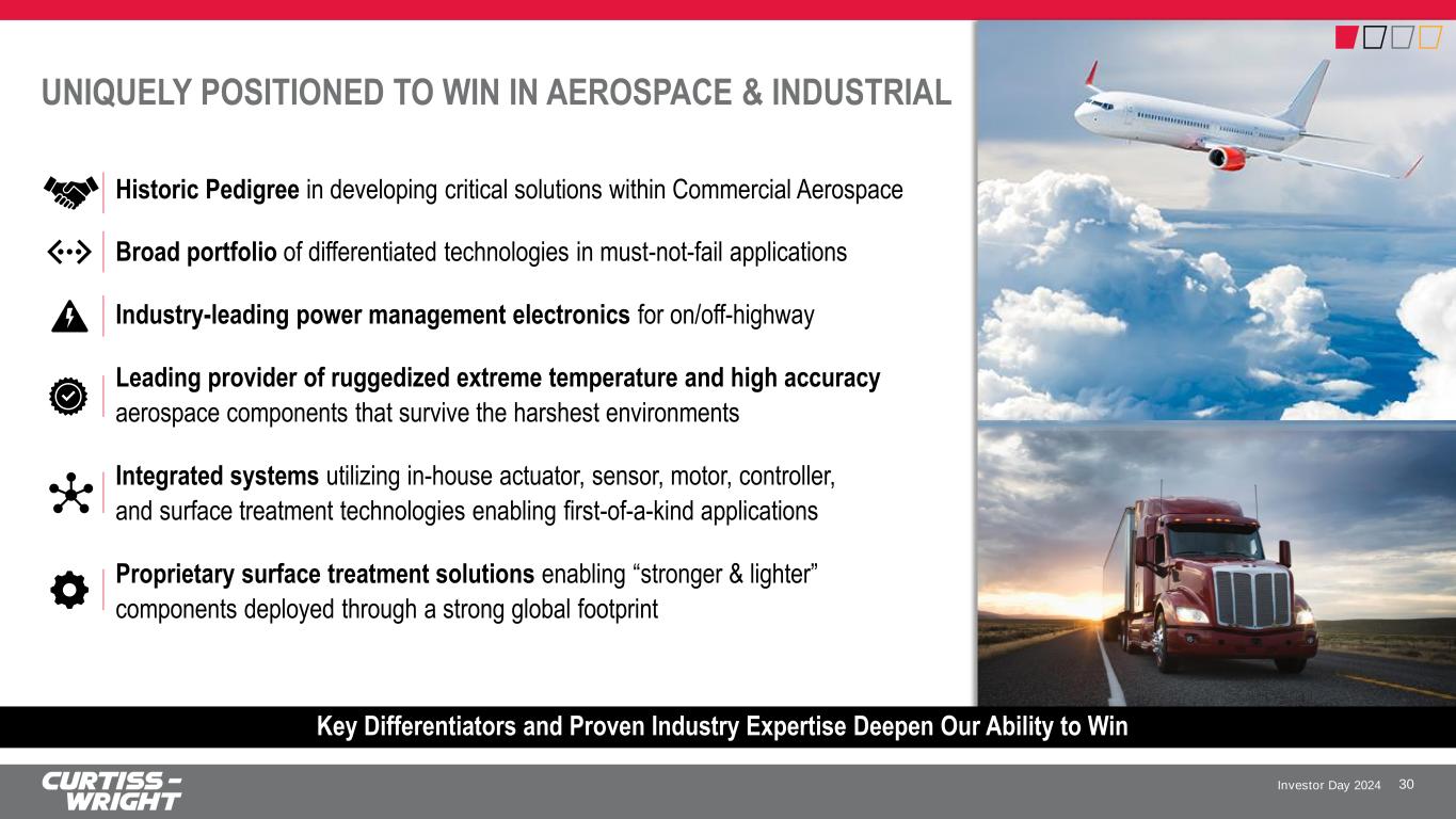 Investor Day 2024 AEROSPACE & INDUSTRIAL: BROAD MARKET APPLICABILITY DRIVING EFFICIENCY, PERFORMANCE AND SAFETY 29 50% COMMERCIAL AEROSPACE & DEFENSE 50% Diverse Customer Base (Select Examples)Broad Portfolio of Critical Solutions • Electromechanical Actuation • Aerospace Sensors and Valves • Power Electronics and Controls • Surface Treatment Services Significant Accomplishments Since 2021 Investor Day • Electromechanical actuation wins on Airbus A350F and UpNext, and Leidos Dynetics Enduring Shield programs • Newly developed power management electronics win with leading truck OEM • Aerospace industry partnership in Hydrogen propulsion technologies (FETCH project) • Expansion of laser peening services to commercial engines and F-35 bulkheads