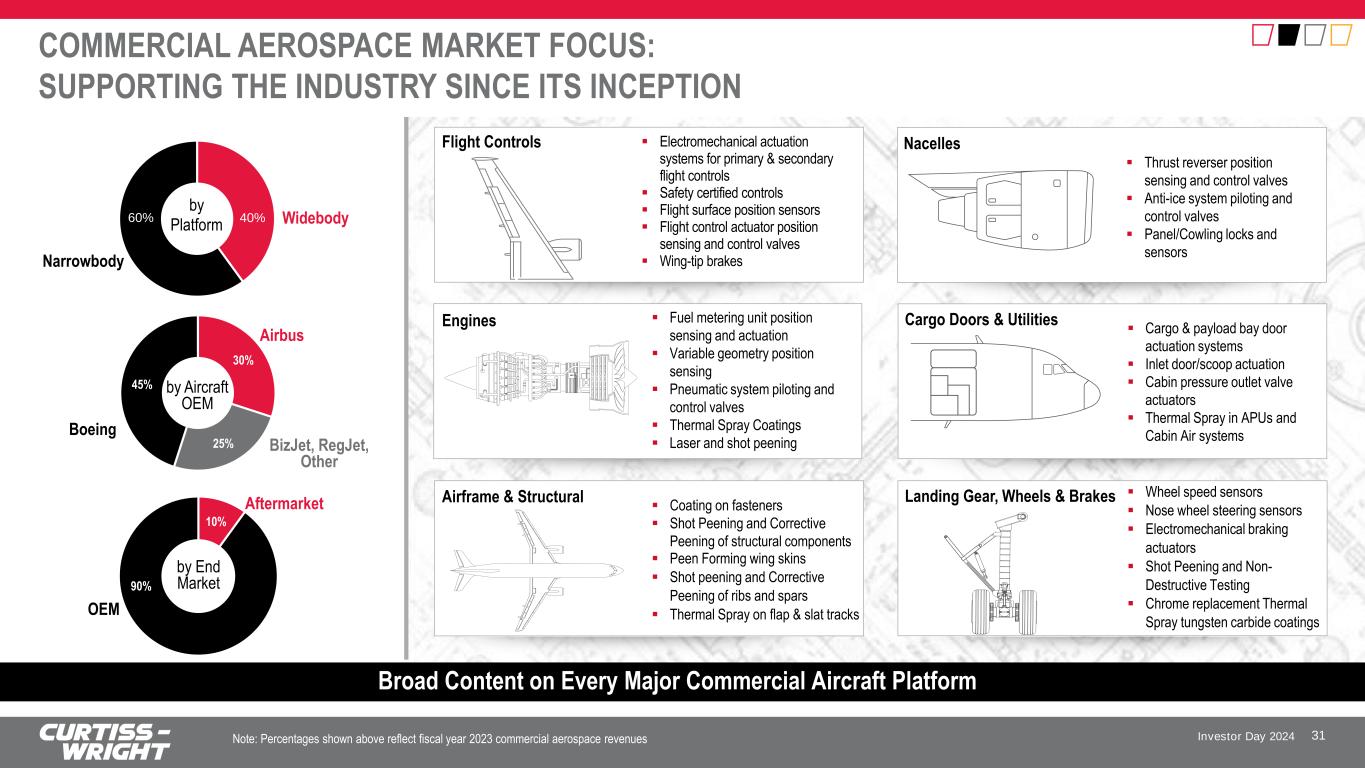 Investor Day 2024 UNIQUELY POSITIONED TO WIN IN AEROSPACE & INDUSTRIAL 30 Key Differentiators and Proven Industry Expertise Deepen Our Ability to Win Broad portfolio of differentiated technologies in must-not-fail applications Industry-leading power management electronics for on/off-highway Leading provider of ruggedized extreme temperature and high accuracy aerospace components that survive the harshest environments Integrated systems utilizing in-house actuator, sensor, motor, controller, and surface treatment technologies enabling first-of-a-kind applications Proprietary surface treatment solutions enabling “stronger & lighter” components deployed through a strong global footprint Historic Pedigree in developing critical solutions within Commercial Aerospace