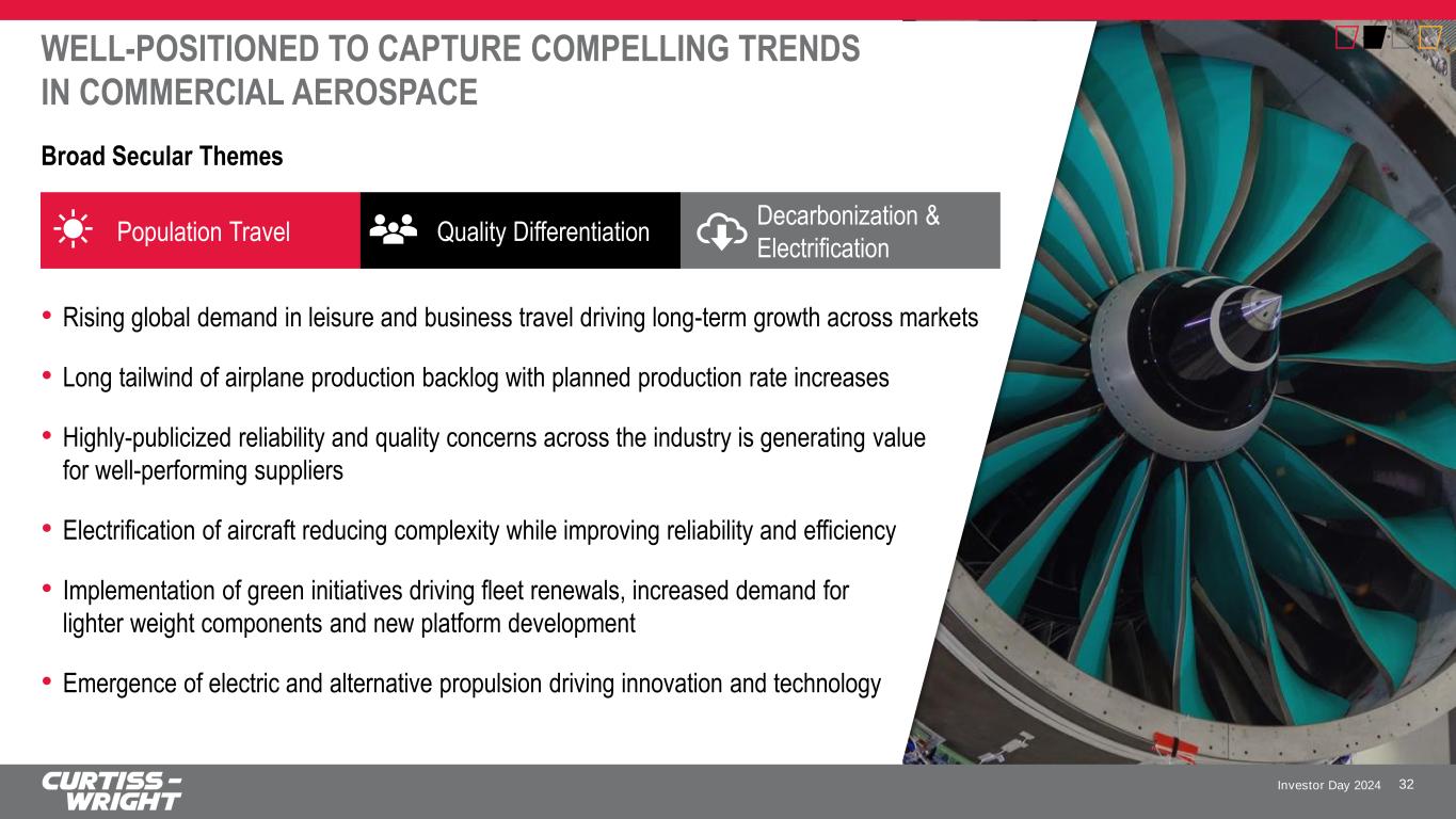 Investor Day 2024 COMMERCIAL AEROSPACE MARKET FOCUS: SUPPORTING THE INDUSTRY SINCE ITS INCEPTION 31 Broad Content on Every Major Commercial Aircraft Platform ▪ Cargo & payload bay door actuation systems ▪ Inlet door/scoop actuation ▪ Cabin pressure outlet valve actuators ▪ Thermal Spray in APUs and Cabin Air systems Cargo Doors & Utilities Flight Controls ▪ Electromechanical actuation systems for primary & secondary flight controls ▪ Safety certified controls ▪ Flight surface position sensors ▪ Flight control actuator position sensing and control valves ▪ Wing-tip brakes Engines ▪ Fuel metering unit position sensing and actuation ▪ Variable geometry position sensing ▪ Pneumatic system piloting and control valves ▪ Thermal Spray Coatings ▪ Laser and shot peening ▪ Coating on fasteners ▪ Shot Peening and Corrective Peening of structural components ▪ Peen Forming wing skins ▪ Shot peening and Corrective Peening of ribs and spars ▪ Thermal Spray on flap & slat tracks Airframe & Structural 10% 90% 30% 25% 45% 40%60% by Aircraft OEM by End Market OEM Aftermarket Boeing Airbus BizJet, RegJet, Other Narrowbody Widebody by Platform Note: Percentages shown above reflect fiscal year 2023 commercial aerospace revenues Nacelles ▪ Thrust reverser position sensing and control valves ▪ Anti-ice system piloting and control valves ▪ Panel/Cowling locks and sensors Landing Gear, Wheels & Brakes ▪ Wheel speed sensors ▪ Nose wheel steering sensors ▪ Electromechanical braking actuators ▪ Shot Peening and Non- Destructive Testing ▪ Chrome replacement Thermal Spray tungsten carbide coatings