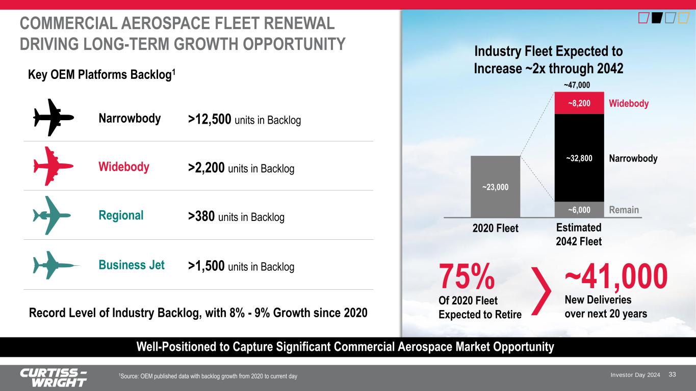 Investor Day 2024 WELL-POSITIONED TO CAPTURE COMPELLING TRENDS IN COMMERCIAL AEROSPACE Broad Secular Themes • Rising global demand in leisure and business travel driving long-term growth across markets • Long tailwind of airplane production backlog with planned production rate increases • Highly-publicized reliability and quality concerns across the industry is generating value for well-performing suppliers • Electrification of aircraft reducing complexity while improving reliability and efficiency • Implementation of green initiatives driving fleet renewals, increased demand for lighter weight components and new platform development • Emergence of electric and alternative propulsion driving innovation and technology 32 Population Travel Quality Differentiation Decarbonization & Electrification