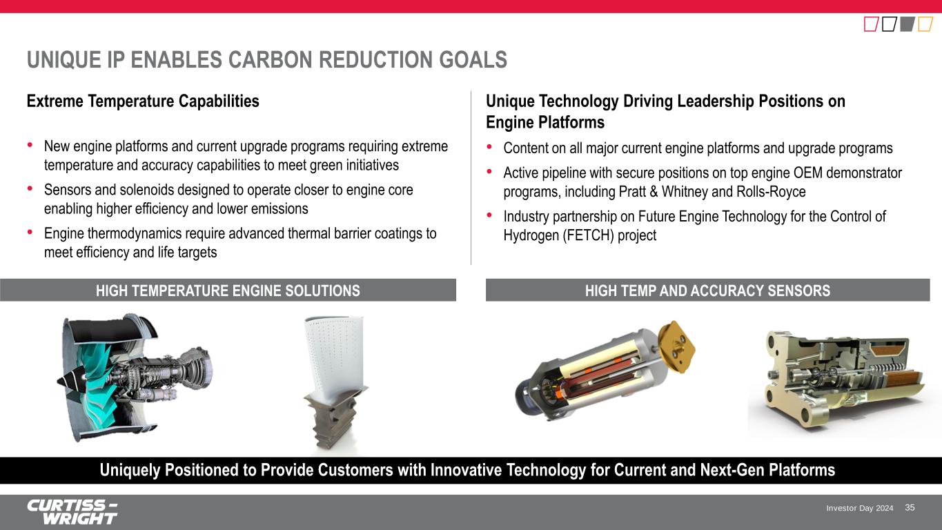 Investor Day 2024 STRATEGIC LONG-TERM GROWTH INITIATIVES 34 Developing Leading Solutions in Electrification Across our Markets • Replace hydraulic and legacy technology actuation systems with EM Actuation • Collaboration across multiple CW entities driving integrated system solutions • Establish differentiated power management electronics that lead the developing electrification of industrial vehicles Innovating Designs and Processes that Enable Carbon Reduction • Enhance sensor, valve, and coatings technology to enable greater engine efficiency • Surface treatments that extend life and reduce weight on structural and dynamically loaded components • Ongoing partnerships with customers and industry to develop alternative propulsion Growing Core and Expanding Content on Current & Next-Gen Platforms • Targeted investments on current platform upgrades and development programs • Upgrade of legacy sensor applications to solid state electronics • Leveraging key supplier relationships to displace underperforming suppliers Leveraging Investments in Critical Technologies and Cross-Market Synergies to Grow the Portfolio