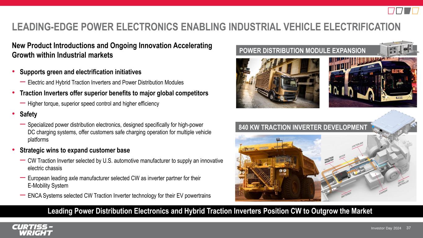 Investor Day 2024 ELECTRIFICATION TECHNOLOGY EXPANDING IN COMMERCIAL AEROSPACE AND CROSSING OVER INTO DEFENSE MARKETS Leveraging Technology to Win in Defense Markets • Electromechanical actuation expanding into ground defense applications • Delivering on development contract on Leidos Dynetics Enduring Shield program • Securing design wins on classified DoD programs, with active and maturing opportunity pipeline Leading Electromechanical Actuation Technology in Commercial Aerospace 36 Product and Technology Synergies across Portfolio Enable Unique, Cross-market Opportunities • Vertically integrated and specialist provider of electromechanical solutions • Won first certified rotary electromechanical distributed flap system in commercial aerospace • First crewed flight with fully EM-actuated flight controls on Eviation Alice all-electric aircraft • One CW approach enabled key content on Airbus wing demonstrator and A350F • Industry-first folding wingtip solution that operates in-flight for load alleviation; combines technologies from across the CW portfolio • Flight test hardware qualified and delivered to Airbus • Flight testing scheduled for 2025 to feed into design concepts for future platforms Tier One System Supply One CW Approach Driving Success