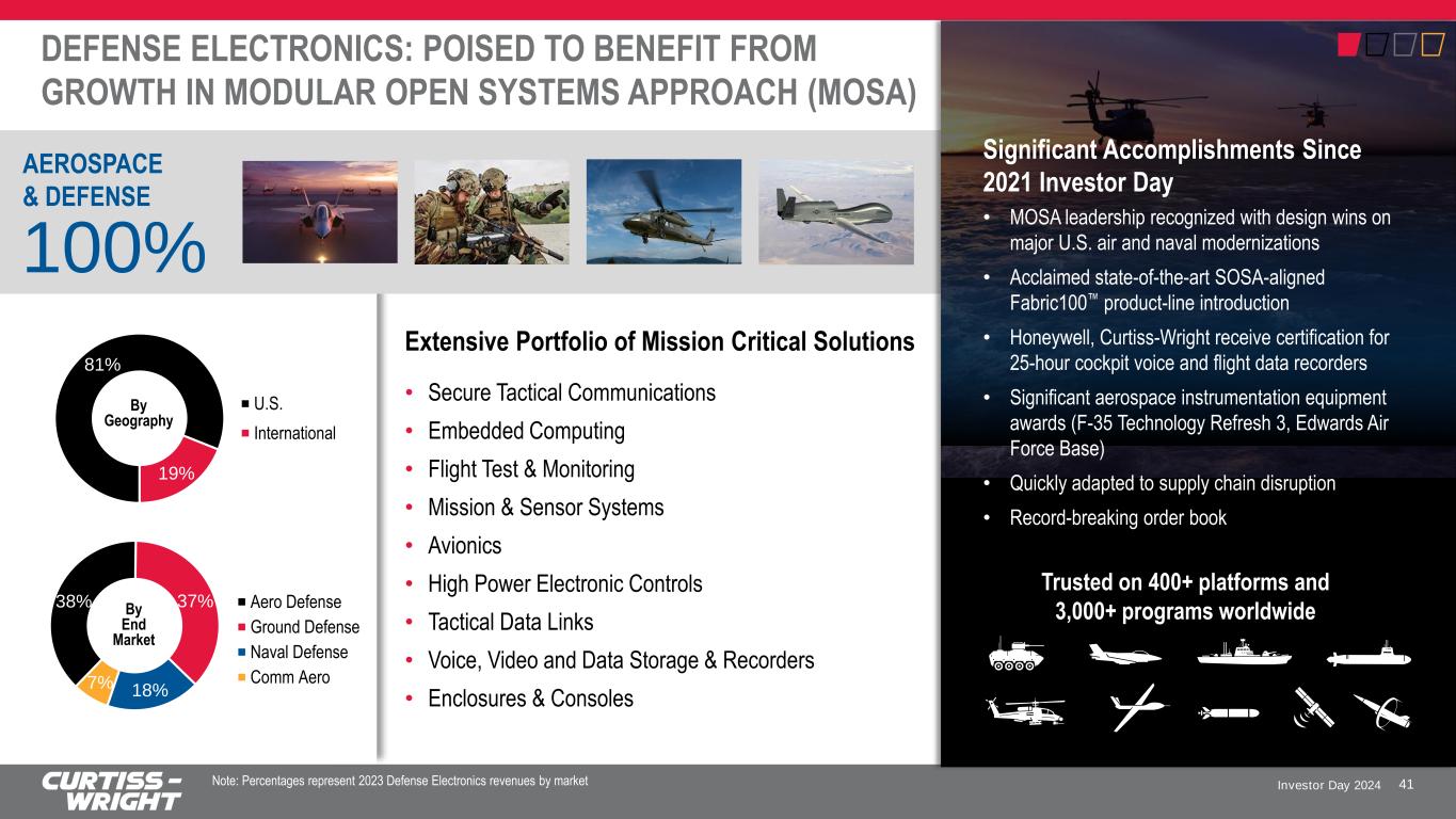 Investor Day 2024 Well-positioned to capture increases in global defense spending with ability to win in any budget environment DEFENSE ELECTRONICS KEY MESSAGES 40 Global security concerns driving increased U.S. and allied funding to support modernization and next-generation requirements Targeting innovation and investments that align to current and future mission needs while addressing growing demand for platform sustainment 4 1 2 3 Trusted, proven leader in integrating open industry standards into ruggedized, reliable and secure computing and communications solutions