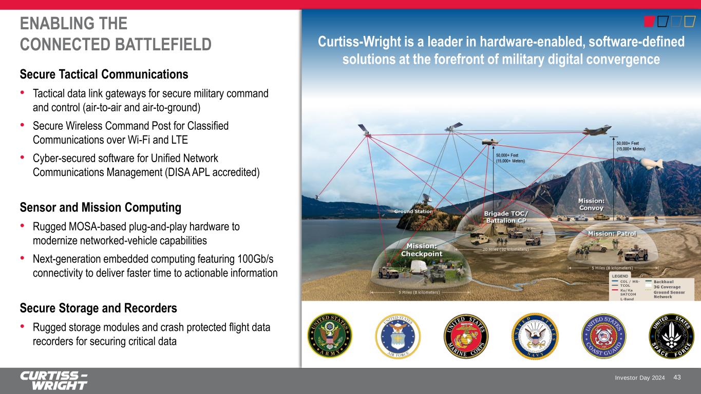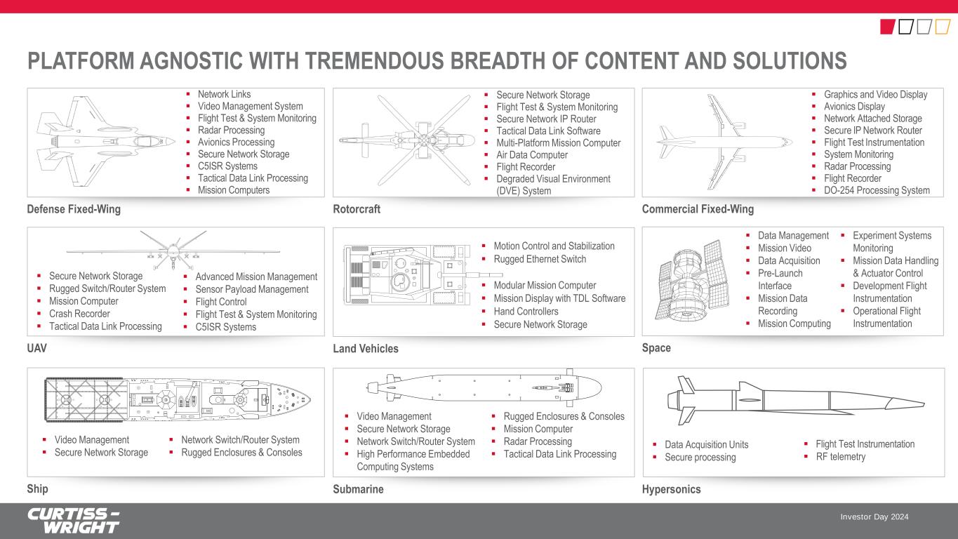 Investor Day 2024 PLATFORM AGNOSTIC WITH TREMENDOUS BREADTH OF CONTENT AND SOLUTIONS Defense Fixed-Wing ▪ Network Links ▪ Video Management System ▪ Flight Test & System Monitoring ▪ Radar Processing ▪ Avionics Processing ▪ Secure Network Storage ▪ C5ISR Systems ▪ Tactical Data Link Processing ▪ Mission Computers Rotorcraft ▪ Secure Network Storage ▪ Flight Test & System Monitoring ▪ Secure Network IP Router ▪ Tactical Data Link Software ▪ Multi-Platform Mission Computer ▪ Air Data Computer ▪ Flight Recorder ▪ Degraded Visual Environment (DVE) System Commercial Fixed-Wing ▪ Graphics and Video Display ▪ Avionics Display ▪ Network Attached Storage ▪ Secure IP Network Router ▪ Flight Test Instrumentation ▪ System Monitoring ▪ Radar Processing ▪ Flight Recorder ▪ DO-254 Processing System UAV ▪ Secure Network Storage ▪ Rugged Switch/Router System ▪ Mission Computer ▪ Crash Recorder ▪ Tactical Data Link Processing ▪ Advanced Mission Management ▪ Sensor Payload Management ▪ Flight Control ▪ Flight Test & System Monitoring ▪ C5ISR Systems Land Vehicles ▪ Motion Control and Stabilization ▪ Rugged Ethernet Switch ▪ Modular Mission Computer ▪ Mission Display with TDL Software ▪ Hand Controllers ▪ Secure Network Storage Space ▪ Data Management ▪ Mission Video ▪ Data Acquisition ▪ Pre-Launch Interface ▪ Mission Data Recording ▪ Mission Computing Ship Submarine ▪ Video Management ▪ Secure Network Storage ▪ Network Switch/Router System ▪ Rugged Enclosures & Consoles ▪ Video Management ▪ Secure Network Storage ▪ Network Switch/Router System ▪ High Performance Embedded Computing Systems ▪ Rugged Enclosures & Consoles ▪ Mission Computer ▪ Radar Processing ▪ Tactical Data Link Processing Hypersonics ▪ Experiment Systems Monitoring ▪ Mission Data Handling & Actuator Control ▪ Development Flight Instrumentation ▪ Operational Flight Instrumentation ▪ Data Acquisition Units ▪ Secure processing ▪ Flight Test Instrumentation ▪ RF telemetry