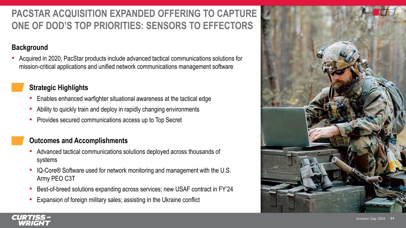 Investor Day 2024 ENABLING THE CONNECTED BATTLEFIELD 43 Secure Tactical Communications • Tactical data link gateways for secure military command and control (air-to-air and air-to-ground) • Secure Wireless Command Post for Classified Communications over Wi-Fi and LTE • Cyber-secured software for Unified Network Communications Management (DISA APL accredited) Sensor and Mission Computing • Rugged MOSA-based plug-and-play hardware to modernize networked-vehicle capabilities • Next-generation embedded computing featuring 100Gb/s connectivity to deliver faster time to actionable information Secure Storage and Recorders • Rugged storage modules and crash protected flight data recorders for securing critical data Curtiss-Wright is a leader in hardware-enabled, software-defined solutions at the forefront of military digital convergence