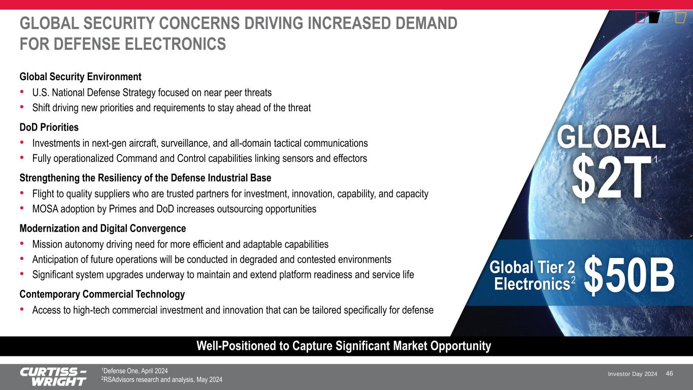 Investor Day 2024 UNIQUELY POSITIONED TO WIN IN DEFENSE ELECTRONICS Proven Ability to Drive Accelerated Growth Across Our Markets Broadest Leading-Edge Portfolio in Industry enabling acceleration of new capabilities while simplifying modernization and sustainment Strong Domain Expertise with 30+ years experience in the field Established IP enables expansion into adjacent emerging markets, such as space and hypersonics Longevity of Supply – 20+ years product life support for platform extensions and modernization Trusted and Proven Provider of Modular Open Systems Approaches (MOSA) supporting current and next-generation platforms 45