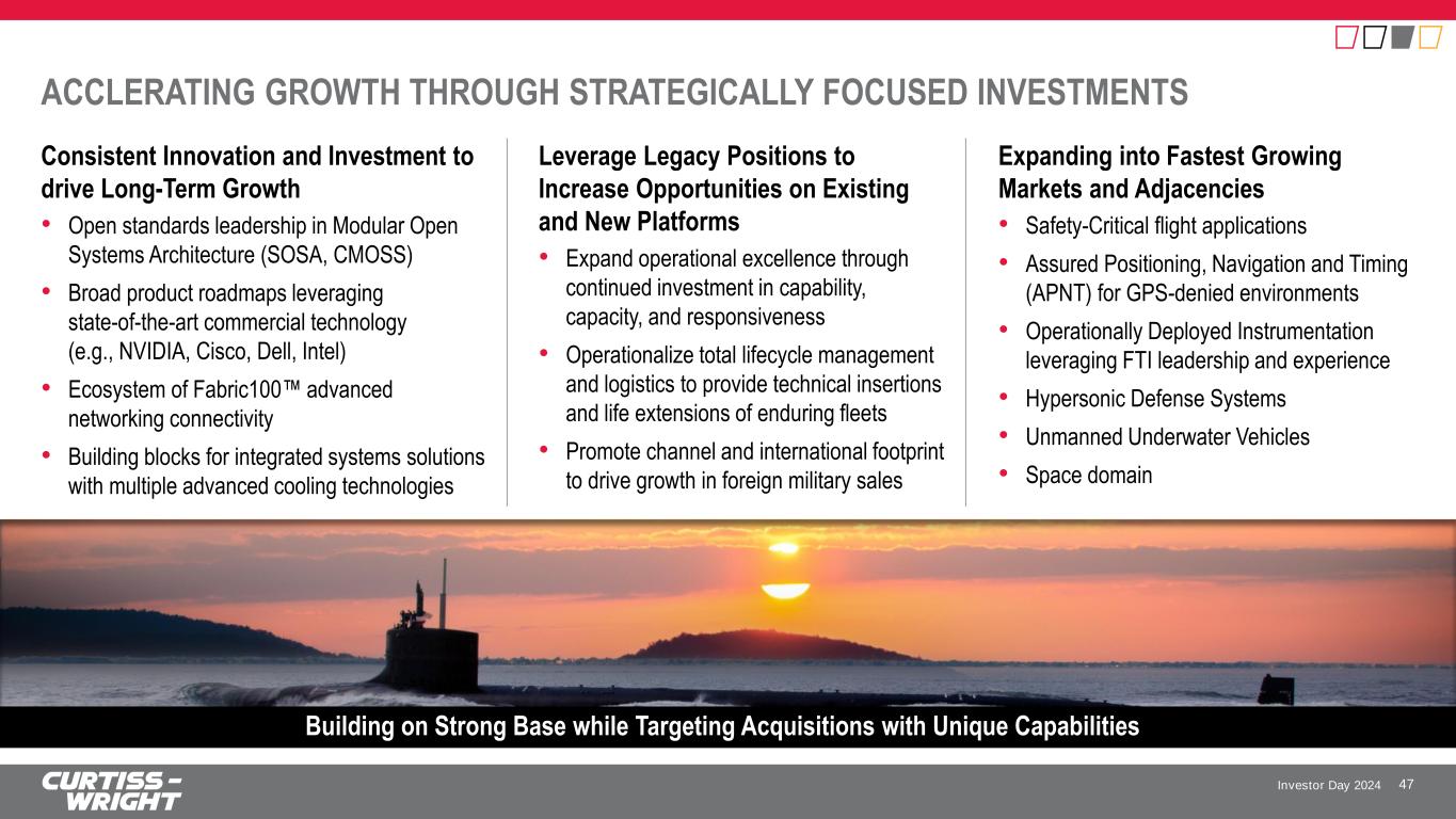 Investor Day 2024 $50BGlobal Tier 2 Electronics GLOBAL $2T 1 2 GLOBAL SECURITY CONCERNS DRIVING INCREASED DEMAND FOR DEFENSE ELECTRONICS Global Security Environment • U.S. National Defense Strategy focused on near peer threats • Shift driving new priorities and requirements to stay ahead of the threat DoD Priorities • Investments in next-gen aircraft, surveillance, and all-domain tactical communications • Fully operationalized Command and Control capabilities linking sensors and effectors Strengthening the Resiliency of the Defense Industrial Base • Flight to quality suppliers who are trusted partners for investment, innovation, capability, and capacity • MOSA adoption by Primes and DoD increases outsourcing opportunities Modernization and Digital Convergence • Mission autonomy driving need for more efficient and adaptable capabilities • Anticipation of future operations will be conducted in degraded and contested environments • Significant system upgrades underway to maintain and extend platform readiness and service life Contemporary Commercial Technology • Access to high-tech commercial investment and innovation that can be tailored specifically for defense 46 Well-Positioned to Capture Significant Market Opportunity 1Defense One, April 2024 2RSAdvisors research and analysis, May 2024