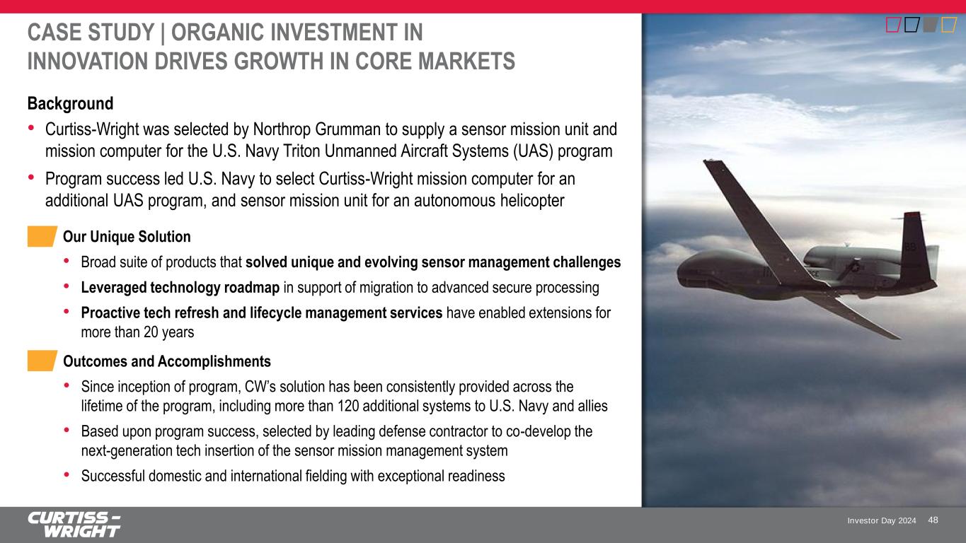 Investor Day 2024 ACCLERATING GROWTH THROUGH STRATEGICALLY FOCUSED INVESTMENTS 47 Expanding into Fastest Growing Markets and Adjacencies • Safety-Critical flight applications • Assured Positioning, Navigation and Timing (APNT) for GPS-denied environments • Operationally Deployed Instrumentation leveraging FTI leadership and experience • Hypersonic Defense Systems • Unmanned Underwater Vehicles • Space domain Leverage Legacy Positions to Increase Opportunities on Existing and New Platforms • Expand operational excellence through continued investment in capability, capacity, and responsiveness • Operationalize total lifecycle management and logistics to provide technical insertions and life extensions of enduring fleets • Promote channel and international footprint to drive growth in foreign military sales Consistent Innovation and Investment to drive Long-Term Growth • Open standards leadership in Modular Open Systems Architecture (SOSA, CMOSS) • Broad product roadmaps leveraging state-of-the-art commercial technology (e.g., NVIDIA, Cisco, Dell, Intel) • Ecosystem of Fabric100 advanced networking connectivity • Building blocks for integrated systems solutions with multiple advanced cooling technologies Building On Strong Base While Targeting Acquisitions With Unique CapabilitiesBuilding o w i with Unique Capabilities