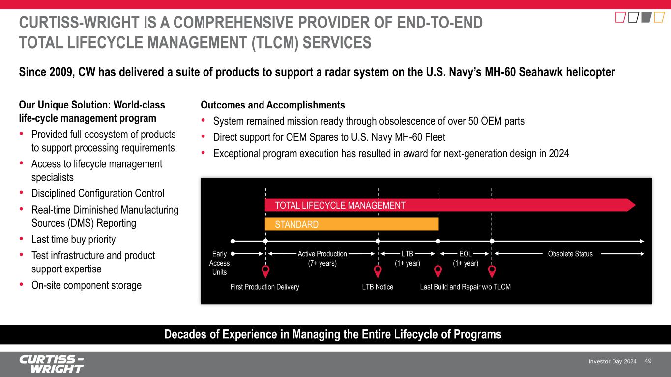 Investor Day 2024 CASE STUDY | ORGANIC INVESTMENT IN INNOVATION DRIVES GROWTH IN CORE MARKETS Background • Curtiss-Wright was selected by Northrop Grumman to supply a sensor mission unit and mission computer for the U.S. Navy Triton Unmanned Aircraft Systems (UAS) program • Program success led U.S. Navy to select Curtiss-Wright mission computer for an additional UAS program, and sensor mission unit for an autonomous helicopter 48 Our Unique Solution • Broad suite of products that solved unique and evolving sensor management challenges • Leveraged technology roadmap in support of migration to advanced secure processing • Proactive tech refresh and lifecycle management services have enabled extensions for more than 20 years Outcomes and Accomplishments • Since inception of program, CW’s solution has been consistently provided across the lifetime of the program, including more than 120 additional systems to U.S. Navy and allies • Based upon program success, selected by leading defense contractor to co-develop the next-generation tech insertion of the sensor mission management system • Successful domestic and international fielding with exceptional readiness