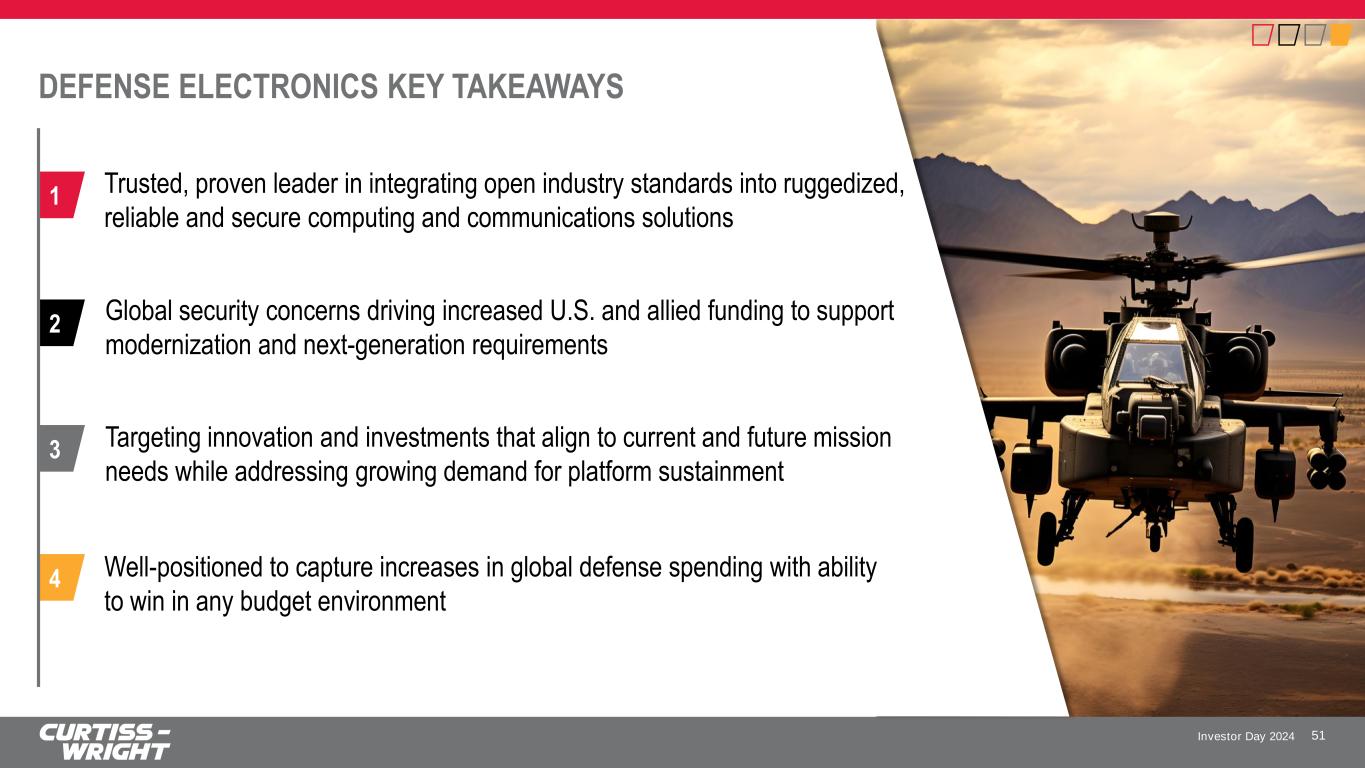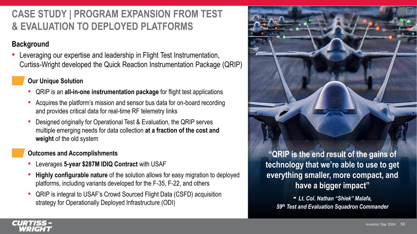Investor Day 2024 CASE STUDY | PROGRAM EXPANSION FROM TEST & EVALUATION TO DEPLOYED PLATFORMS Background • Leveraging our expertise and leadership in Flight Test Instrumentation, Curtiss-Wright developed the Quick Reaction Instrumentation Package (QRIP) 50 Our Unique Solution • QRIP is an all-in-one instrumentation package for flight test applications • Acquires the platform’s mission and sensor bus data for on-board recording and provides critical data for real-time RF telemetry links • Designed originally for Operational Test & Evaluation, the QRIP serves multiple emerging needs for data collection at a fraction of the cost and weight of the old system Outcomes and Accomplishments • Leverages 5-year $287M IDIQ Contract with USAF • Highly configurable nature of the solution allows for easy migration to deployed platforms, including variants developed for the F-35, F-22, and others • QRIP is integral to USAF’s Crowd Sourced Flight Data (CSFD) acquisition strategy for Operationally Deployed Infrastructure (ODI) “QRIP is the end result of the gains of technology that we’re able to use to get everything smaller, more compact, and have a bigger impact” - Lt. Col. Nathan “Shiek” Malafa, 59th Test and Evaluation Squadron Commander