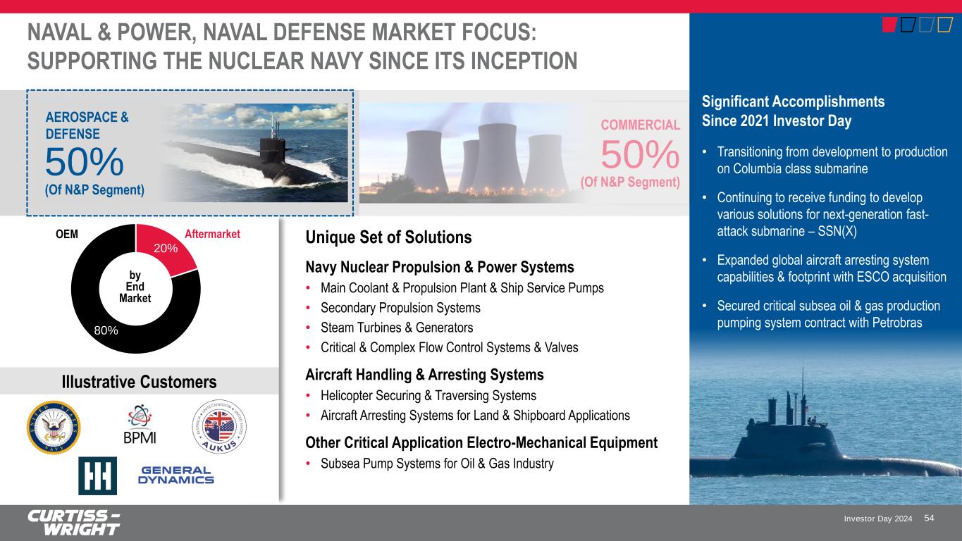 Investor Day 2024 NAVAL DEFENSE KEY MESSAGES 53 4 1 2 3 Well-positioned to deliver decades of long-term sustainable growth aligned with U.S. and allied naval force structures Expanding content & advancing key technologies on current & future platforms while capturing growing demand in aftermarket Mission critical partner to U.S. & international navies for highly engineered solutions on surface & submarine platforms Rising geopolitical tensions driving increased funding toward U.S. and allied naval shipbuilding