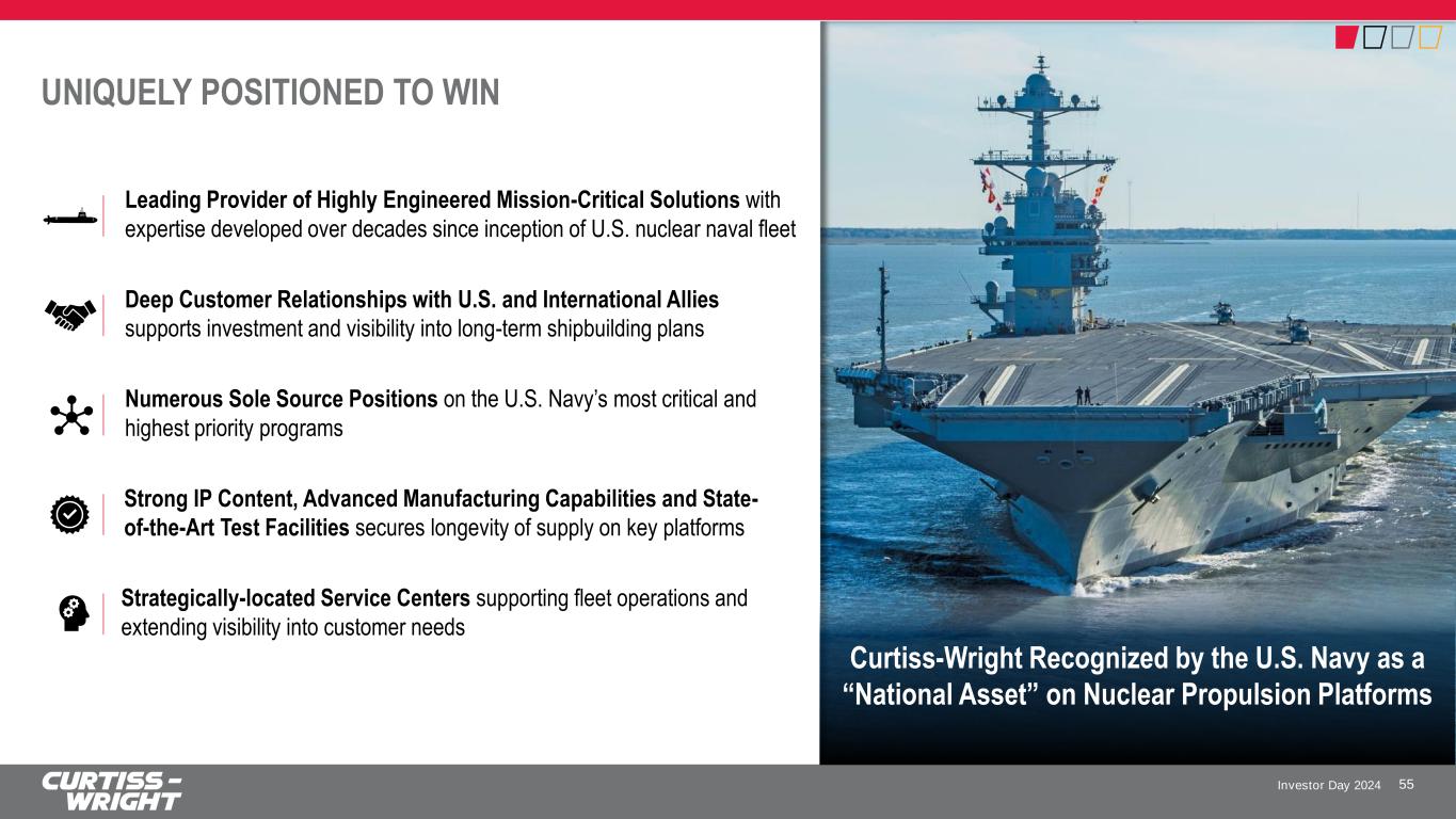 Investor Day 2024 NAVAL & POWER, NAVAL DEFENSE MARKET FOCUS: SUPPORTING THE NUCLEAR NAVY SINCE ITS INCEPTION 54 20% 80% by End Market OEM Aftermarket Unique Set of Solutions Navy Nuclear Propulsion & Power Systems • Main Coolant & Propulsion Plant & Ship Service Pumps • Secondary Propulsion Systems • Steam Turbines & Generators • Critical & Complex Flow Control Systems & Valves Aircraft Handling & Arresting Systems • Helicopter Securing & Traversing Systems • Aircraft Arresting Systems for Land & Shipboard Applications Other Critical Application Electro-Mechanical Equipment • Subsea Pump Systems for Oil & Gas Industry Illustrative Customers Significant Accomplishments Since 2021 Investor Day • Transitioning from development to production on Columbia class submarine • Continuing to receive funding to develop various solutions for next-generation fast- attack submarine – SSN(X) • Expanded global aircraft arresting system capabilities & footprint with ESCO acquisition • Secured critical subsea oil & gas production pumping system contract with Petrobras 50% AEROSPACE & DEFENSE (Of N&P Segment) 50% COMMERCIAL (Of N&P Segment)