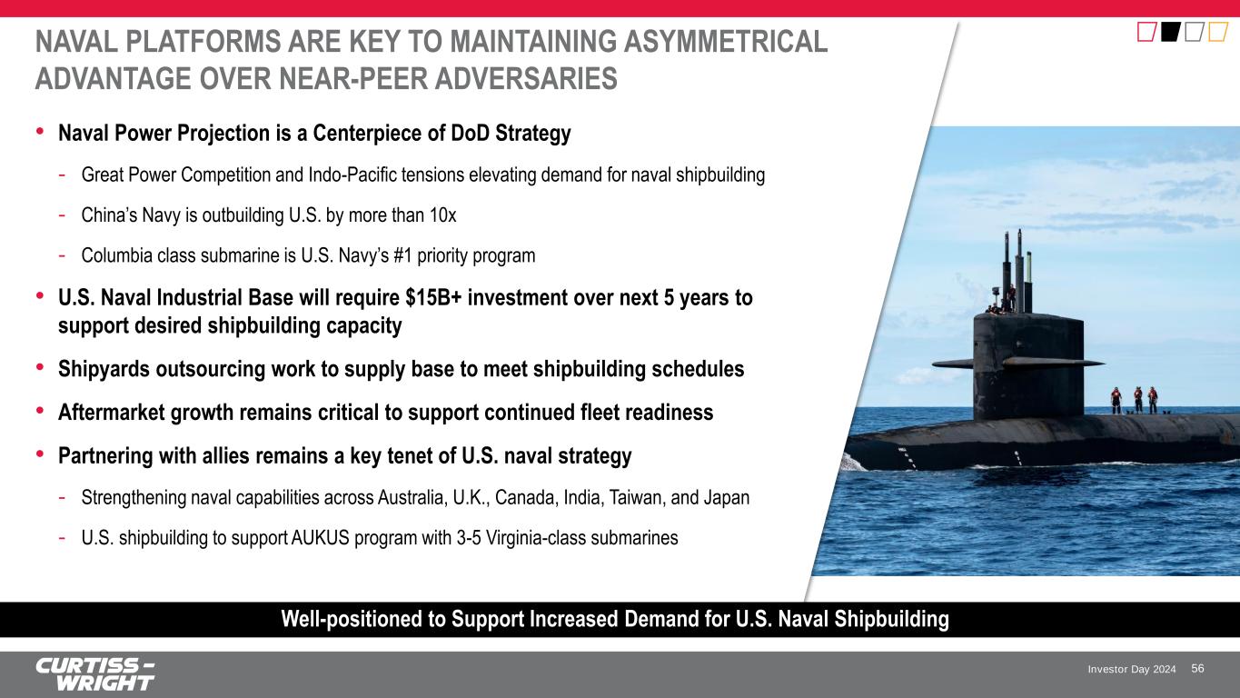 Investor Day 2024 UNIQUELY POSITIONED TO WIN 55 Leading Provider of Highly Engineered Mission-Critical Solutions with expertise developed over decades since inception of U.S. nuclear naval fleet Deep Customer Relationships with U.S. and International Allies supports investment and visibility into long-term shipbuilding plans Numerous Sole Source Positions on the U.S. Navy’s most critical and highest priority programs Strong IP Content, Advanced Manufacturing Capabilities and State- of-the-Art Test Facilities secures longevity of supply on key platforms Curtiss-Wright Recognized by the U.S. Navy as a “National Asset” on Nuclear Propulsion Platforms Strategically-located Service Centers supporting fleet operations and extending visibility into customer needs