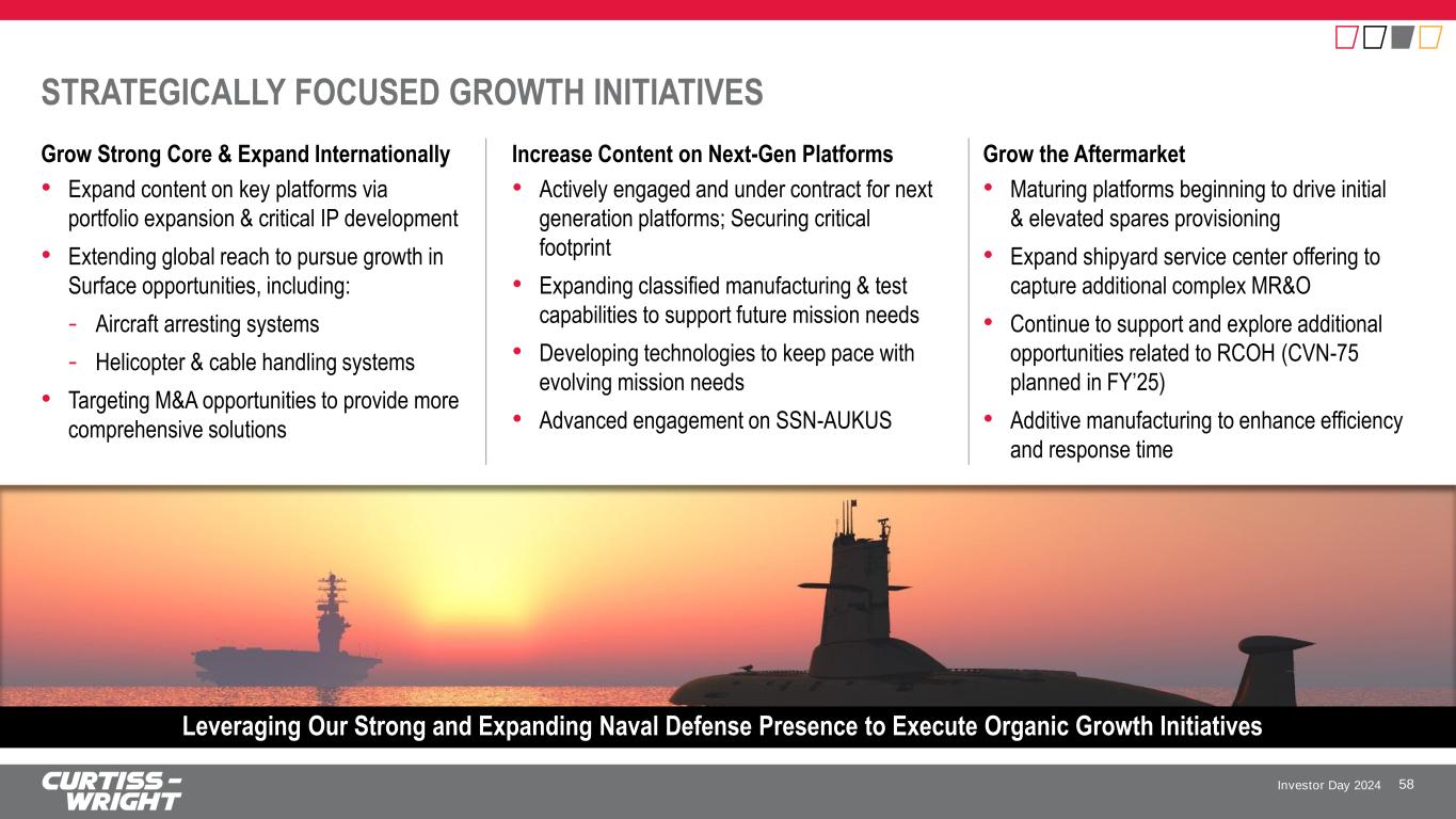 Investor Day 2024 Ford Aircraft Carrier Nimitz Aircraft Carrier RCOH Virginia Submarine Columbia Submarine 30-Yr Authorization Total Ship Projection (FY’25 – FY’53)1 6-7 3 (through FY’35 / CVN-77) 17+ (excluding potential upside from AUKUS and FY’35 transition to SSN(X)) 12 (includes 1st ship in production) Run-Rate Production ~1 every 5 years ~1 every 6 years 2+ per year 1 per year (beginning with 2nd ship, FY’26 thru FY’35) Shipset Content $450M $45M $75M $140M WELL-POSITIONED ON HIGHEST PRIORITY U.S. NAVAL PLATFORMS 57 Continue to Partner in U.S. Navy’s Success while Expanding Critical Technologies & Content 1Source: Official U.S. Navy 30-Year Shipbuilding Plan (aligned with the FY23 Battle Force Ship Assessment & Requirement Study) as submitted with FY25 Presidential Budget Request