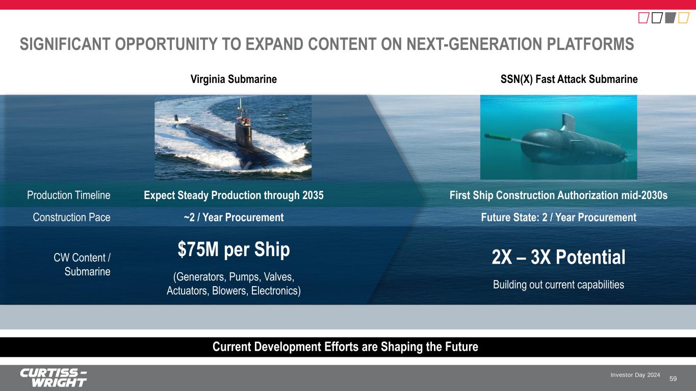 Investor Day 2024 STRATEGICALLY FOCUSED GROWTH INITIATIVES 58 Grow the Aftermarket • Maturing platforms beginning to drive initial & elevated spares provisioning • Expand shipyard service center offering to capture additional complex MR&O • Continue to support and explore additional opportunities related to RCOH (CVN-75 planned in FY’25) • Additive manufacturing to enhance efficiency and response time Increase Content on Next-Gen Platforms • Actively engaged and under contract for next generation platforms; Securing critical footprint • Expanding classified manufacturing & test capabilities to support future mission needs • Developing technologies to keep pace with evolving mission needs • Advanced engagement on SSN-AUKUS Grow Strong Core & Expand Internationally • Expand content on key platforms via portfolio expansion & critical IP development • Extending global reach to pursue growth in Surface opportunities, including: - Aircraft arresting systems - Helicopter & cable handling systems • Targeting M&A opportunities to provide more comprehensive solutions Leveraging Our Strong and Expanding Naval Defense Presence to Execute Organic Growth Initiatives