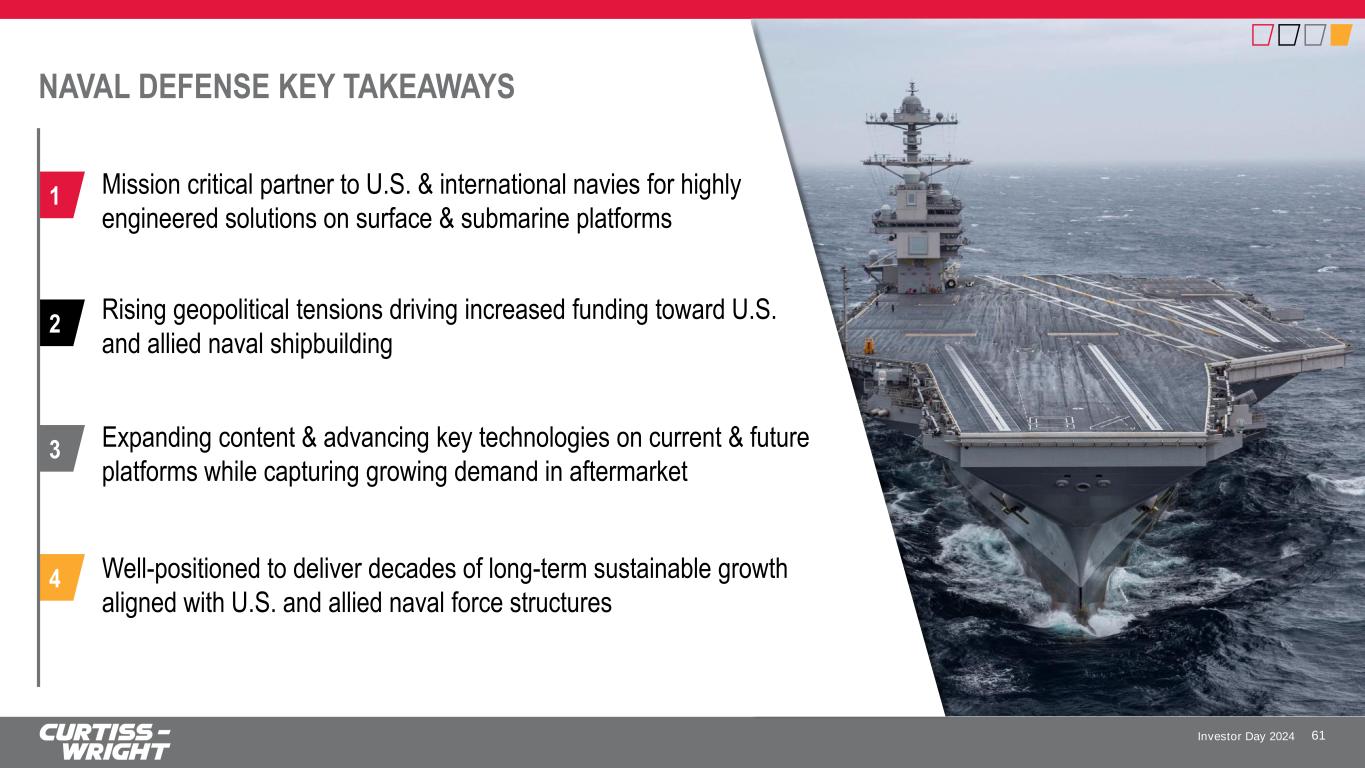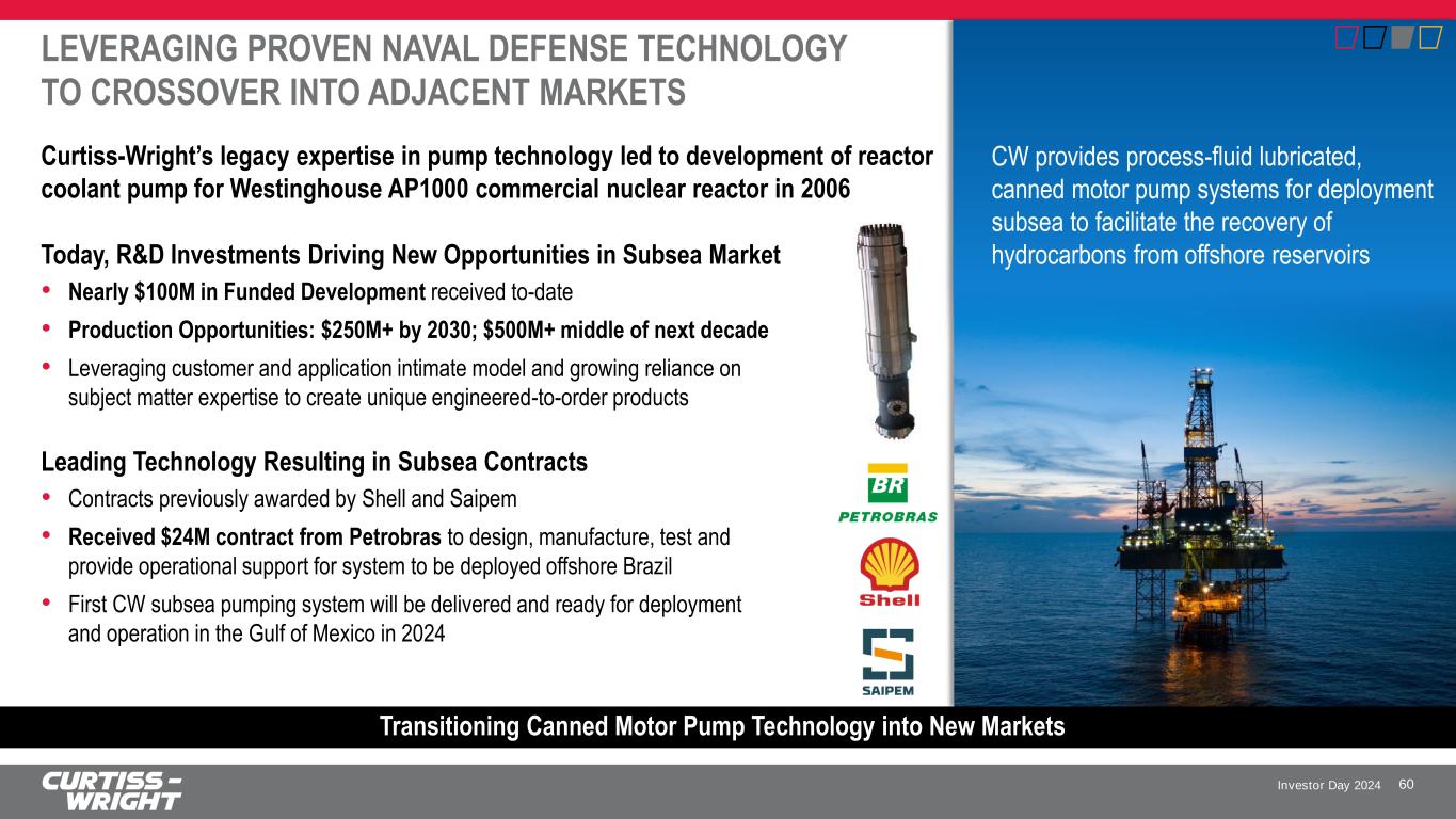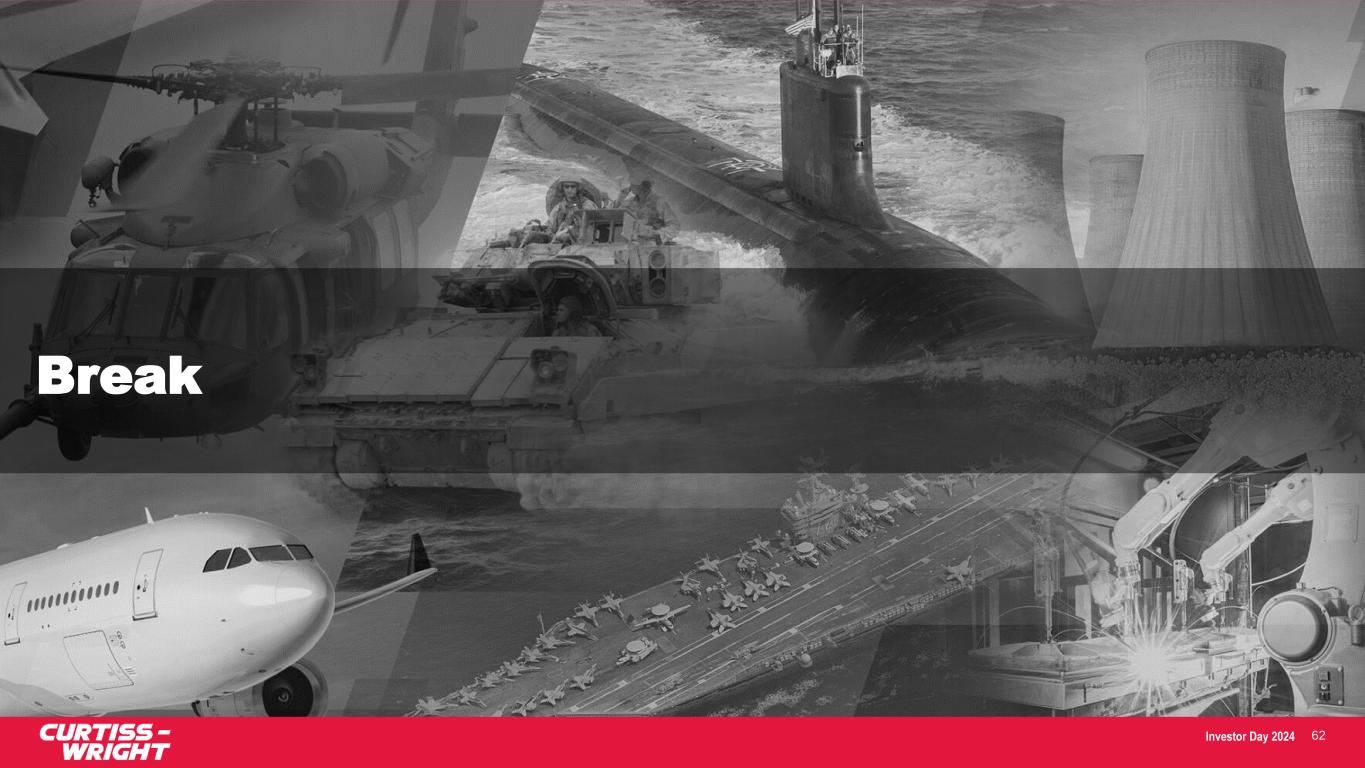 Investor Day 2024 Curtiss-Wright’s legacy expertise in pump technology led to development of reactor coolant pump for Westinghouse AP1000 commercial nuclear reactor in 2006 Today, R&D Investments Driving New Opportunities in Subsea Market • Nearly $100M in Funded Development received to-date • Production Opportunities: $250M+ by 2030; $500M+ middle of next decade • Leveraging customer and application intimate model and growing reliance on subject matter expertise to create unique engineered-to-order products Leading Technology Resulting in Subsea Contracts • Contracts previously awarded by Shell and Saipem • Received $24M contract from Petrobras to design, manufacture, test and provide operational support for system to be deployed offshore Brazil • First CW subsea pumping system will be delivered and ready for deployment and operation in the Gulf of Mexico in 2024 LEVERAGING PROVEN NAVAL DEFENSE TECHNOLOGY TO CROSSOVER INTO ADJACENT MARKETS 60 Transitioning Canned Motor Pump Technology into New Markets CW provides process-fluid lubricated, canned motor pump systems for deployment subsea to facilitate the recovery of hydrocarbons from offshore reservoirs