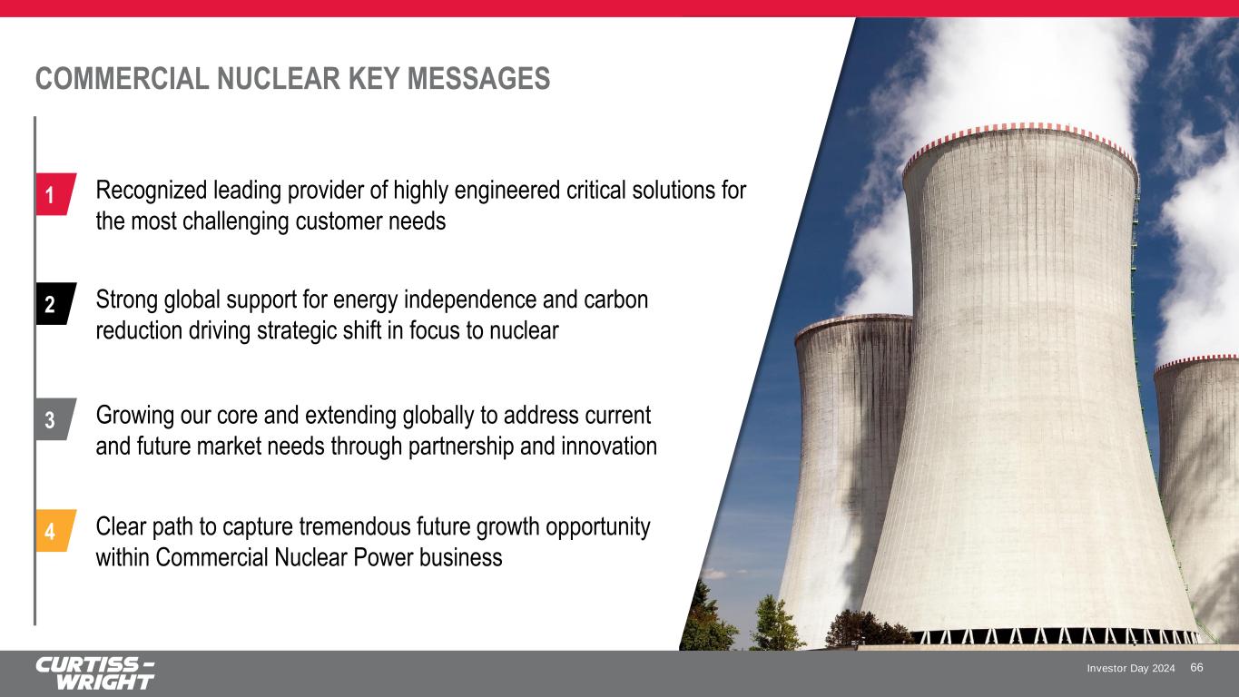 Investor Day 2024 COMMERCIAL NUCLEAR KEY MESSAGES 66 Clear path to capture tremendous future growth opportunity within Commercial Nuclear Power business 4 Recognized leading provider of highly engineered critical solutions for the most challenging customer needs 1 Strong global support for energy independence and carbon reduction driving strategic shift in focus to nuclear 2 Growing our core and extending globally to address current and future market needs through partnership and innovation 3