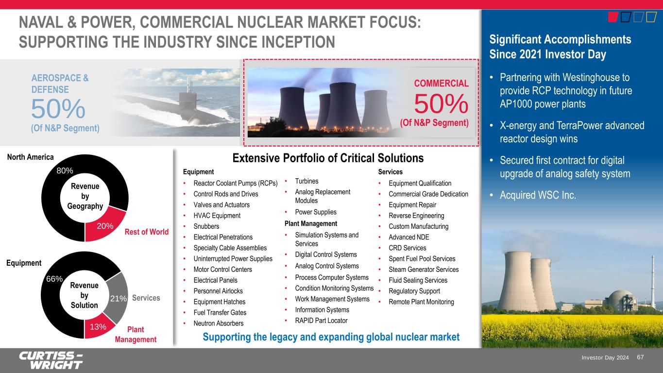 Investor Day 2024 50% AEROSPACE & DEFENSE (Of N&P Segment) 50% COMMERCIAL (Of N&P Segment) Equipment • Reactor Coolant Pumps (RCPs) • Control Rods and Drives • Valves and Actuators • HVAC Equipment • Snubbers • Electrical Penetrations • Specialty Cable Assemblies • Uninterrupted Power Supplies • Motor Control Centers • Electrical Panels • Personnel Airlocks • Equipment Hatches • Fuel Transfer Gates • Neutron Absorbers • Turbines • Analog Replacement Modules • Power Supplies Plant Management • Simulation Systems and Services • Digital Control Systems • Analog Control Systems • Process Computer Systems • Condition Monitoring Systems • Work Management Systems • Information Systems • RAPID Part Locator NAVAL & POWER, COMMERCIAL NUCLEAR MARKET FOCUS: SUPPORTING THE INDUSTRY SINCE INCEPTION Extensive Portfolio of Critical Solutions 67 80% 20% 66% 21% 13% Significant Accomplishments Since 2021 Investor Day • Partnering with Westinghouse to provide RCP technology in future AP1000 power plants • X-energy and TerraPower advanced reactor design wins • Secured first contract for digital upgrade of analog safety system • Acquired WSC Inc. Services • Equipment Qualification • Commercial Grade Dedication • Equipment Repair • Reverse Engineering • Custom Manufacturing • Advanced NDE • CRD Services • Spent Fuel Pool Services • Steam Generator Services • Fluid Sealing Services • Regulatory Support • Remote Plant Monitoring Supporting the legacy and expanding global nuclear market Revenue by Geography Revenue by Solution North America Rest of World Equipment Plant Management Services