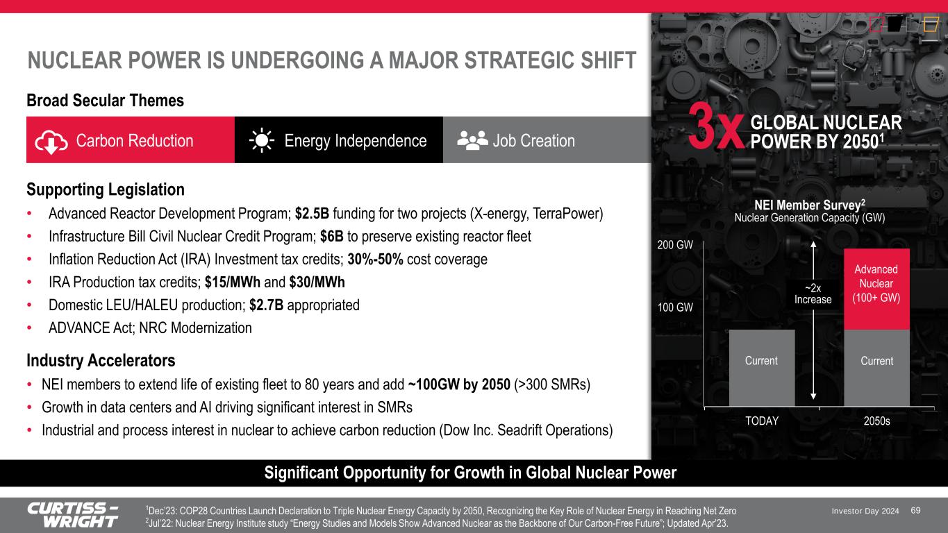 Investor Day 2024 UNIQUELY POSITIONED TO WIN IN COMMERCIAL NUCLEAR Long-standing Aftermarket and New Build Presence Go-to partner for 60 years enhancing power plant efficiency and reliability Industry Certifications and Best-in-Class Expertise Solving our customers most difficult problems with strong barriers to entry One of the Largest Product Portfolios Supporting our customers across a wide spectrum of their needs Deep Customer Relationships More than a supplier…a trusted partner to our customers and the industry Strong Management and Technical Teams Decades in service to the nuclear power industry Nuclear Safety and Quality Culture Everything we do…we do with safety and quality in mind 68 Key Differentiators and Industry Expertise Deepen Our Ability to Win