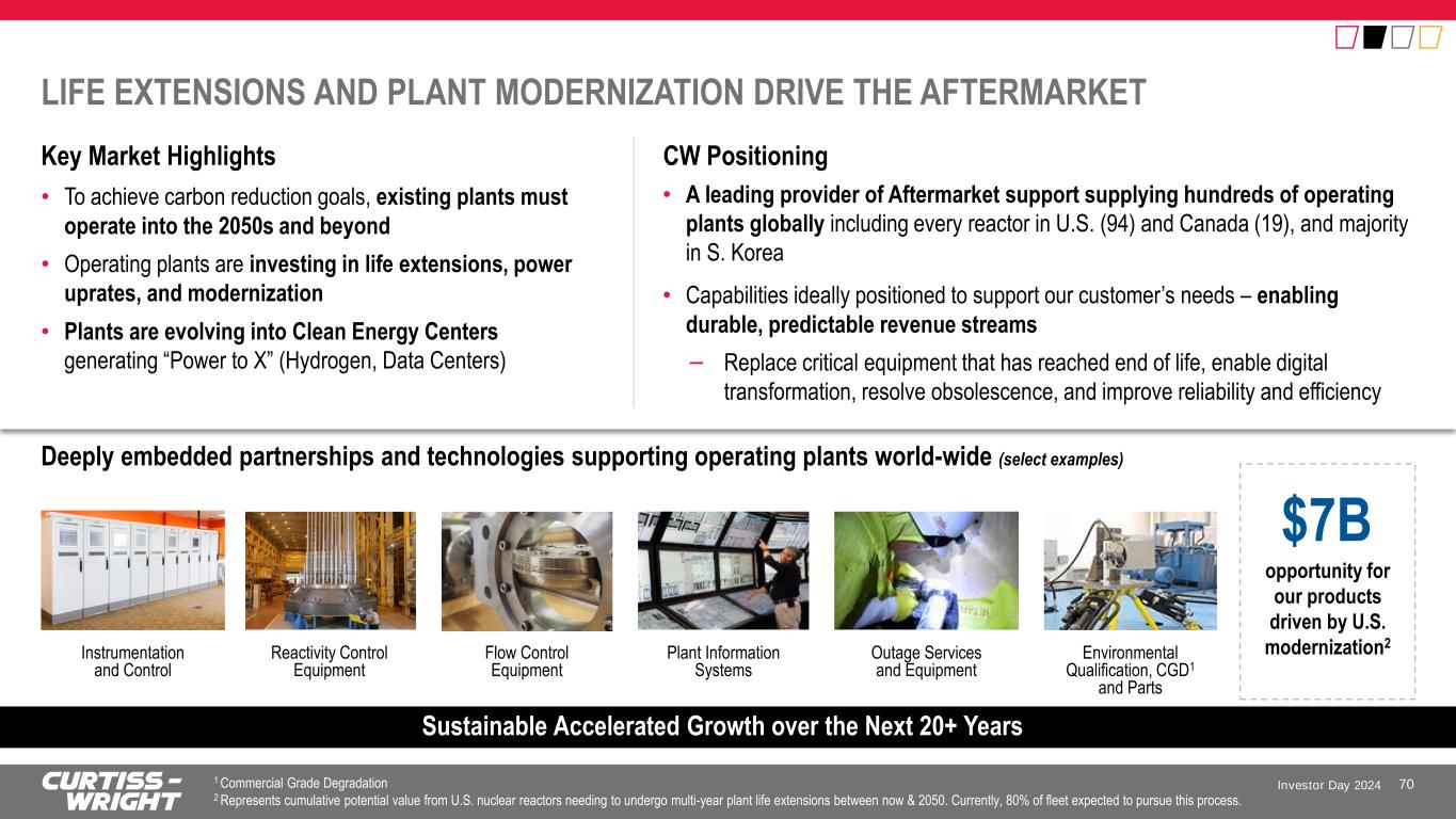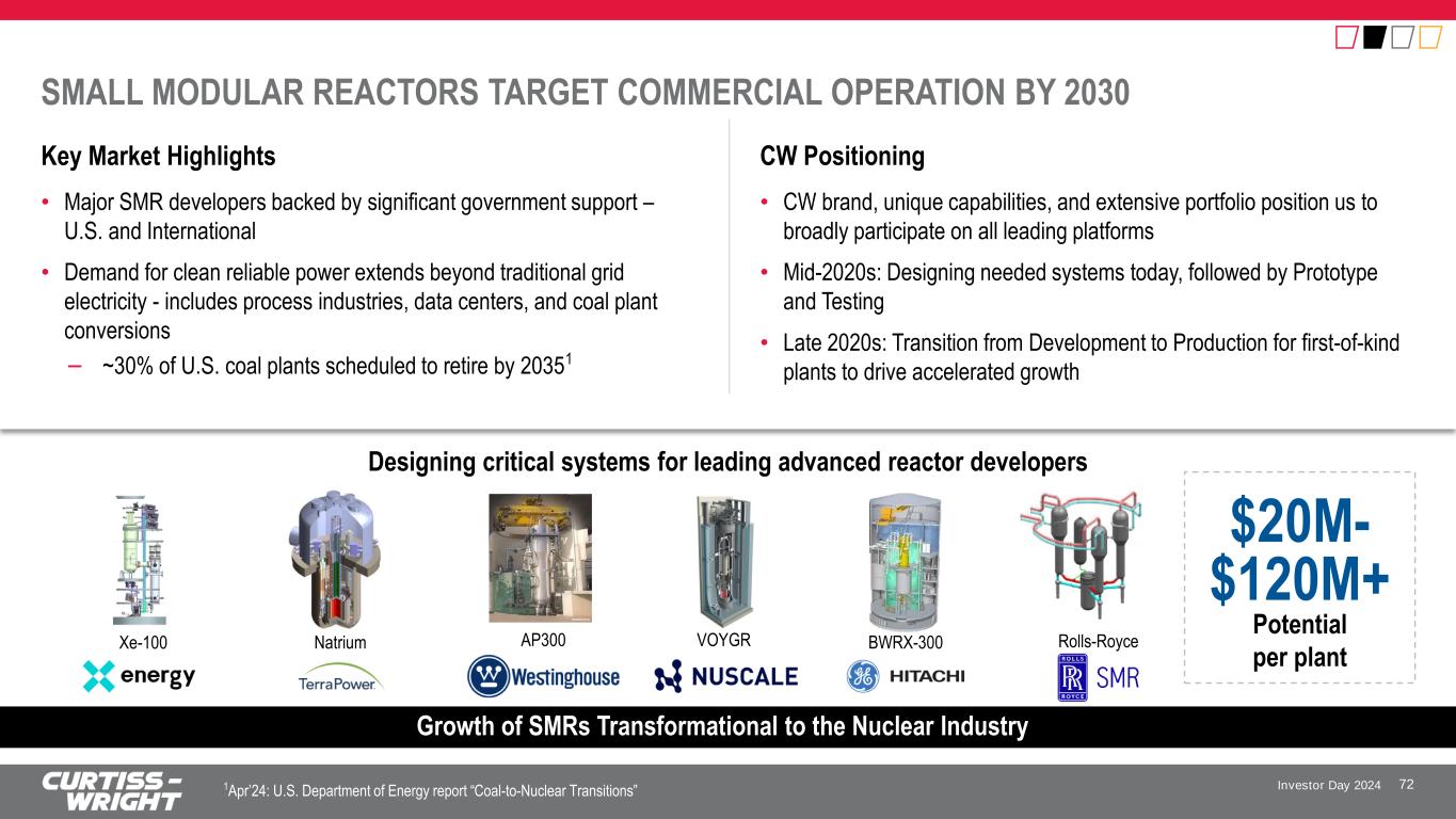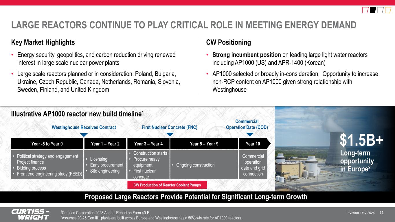 Investor Day 2024 Deeply embedded partnerships and technologies supporting operating plants world-wide (select examples) LIFE EXTENSIONS AND PLANT MODERNIZATION DRIVE THE AFTERMARKET CW Positioning Key Market Highlights 70 Sustainable Accelerated Growth over the Next 20+ Years opportunity for our products driven by U.S. modernization2 Reactivity Control Equipment Flow Control Equipment Plant Information Systems Outage Services and Equipment Environmental Qualification, CGD1 and Parts $7B • To achieve carbon reduction goals, existing plants must operate into the 2050s and beyond • Operating plants are investing in life extensions, power uprates, and modernization • Plants are evolving into Clean Energy Centers generating “Power to X” (Hydrogen, Data Centers) • Capabilities ideally positioned to support our customer’s needs – enabling durable, predictable revenue streams – Replace critical equipment that has reached end of life, enable digital transformation, resolve obsolescence, and improve reliability and efficiency • A leading provider of Aftermarket support supplying hundreds of operating plants globally including every reactor in U.S. (94) and Canada (19), and majority in S. Korea 1 Commercial Grade Degradation 2 Represents cumulative potential value from U.S. nuclear reactors needing to undergo multi-year plant life extensions between now & 2050. Currently, 80% of fleet expected to pursue this process. Instrumentation and Control