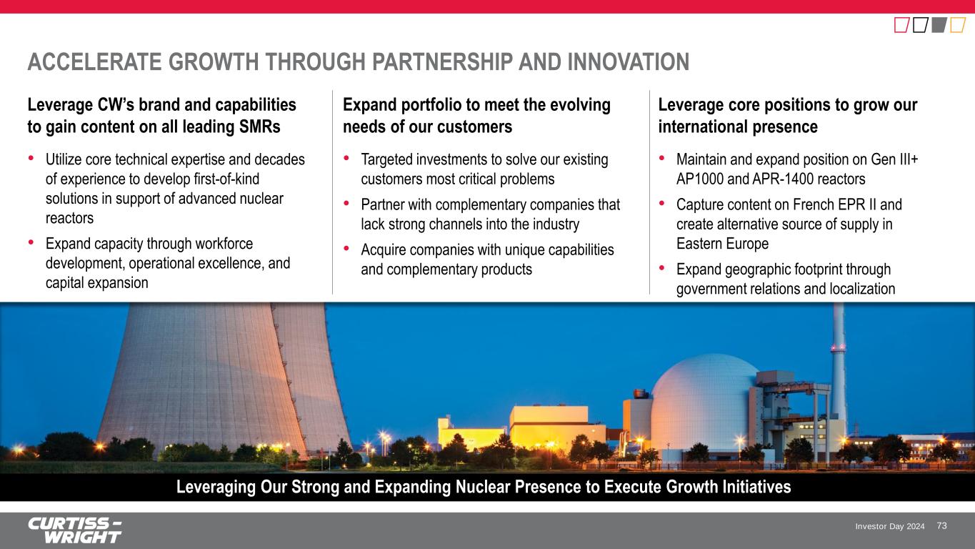 Investor Day 2024 Designing critical systems for leading advanced reactor developers SMALL MODULAR REACTORS TARGET COMMERCIAL OPERATION BY 2030 CW Positioning • CW brand, unique capabilities, and extensive portfolio position us to broadly participate on all leading platforms • Mid-2020s: Designing needed systems today, followed by Prototype and Testing • Late 2020s: Transition from Development to Production for first-of-kind plants to drive accelerated growth Key Market Highlights • Major SMR developers backed by significant government support – U.S. and International • Demand for clean reliable power extends beyond traditional grid electricity - includes process industries, data centers, and coal plant conversions – ~30% of U.S. coal plants scheduled to retire by 20351 72 Growth of SMRs Transformational to the Nuclear Industry Potential per plant $20M- $120M+ Rolls-RoyceAP300 VOYGRXe-100 BWRX-300Natrium 1Apr’24: U.S. Department of Energy report “Coal-to-Nuclear Transitions”