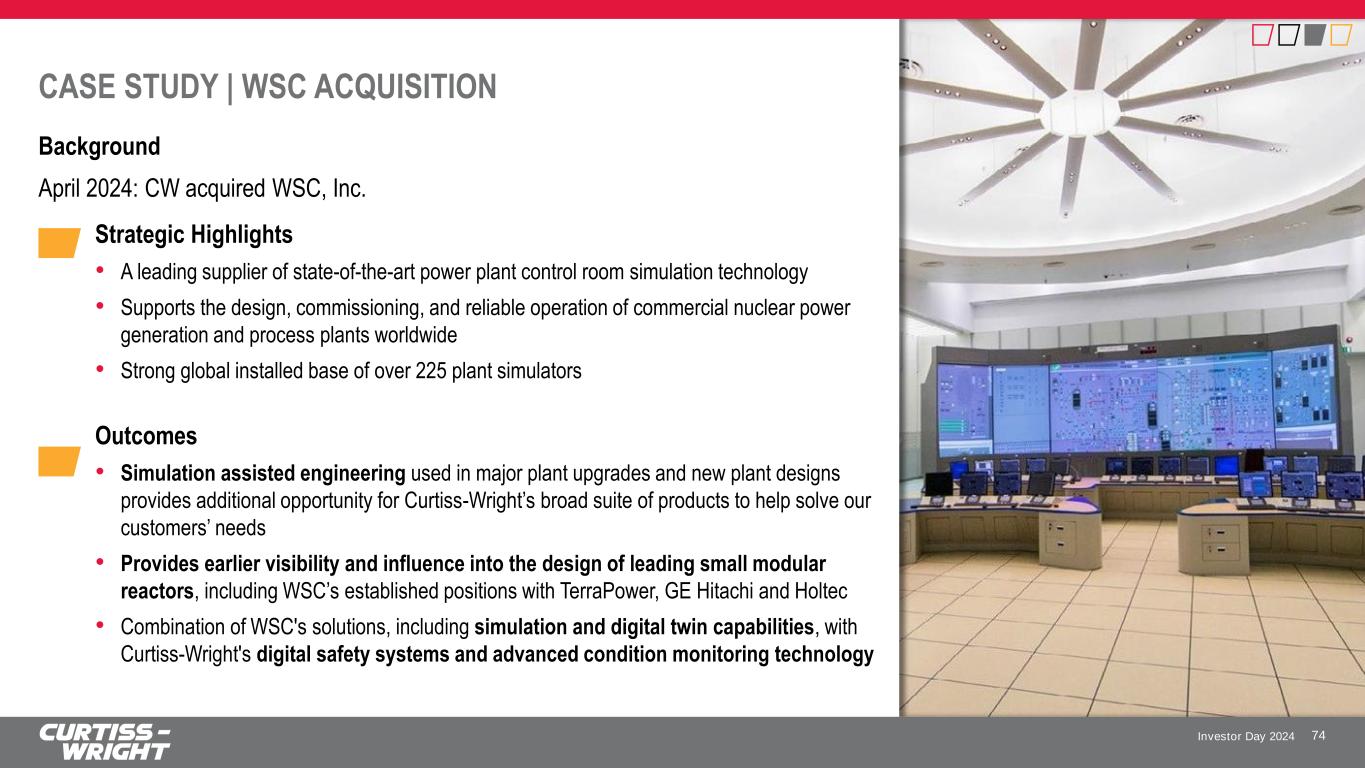 Investor Day 2024 ACCELERATE GROWTH THROUGH PARTNERSHIP AND INNOVATION 73 Leverage core positions to grow our international presence • Maintain and expand position on Gen III+ AP1000 and APR-1400 reactors • Capture content on French EPR II and create alternative source of supply in Eastern Europe • Expand geographic footprint through government relations and localization Expand portfolio to meet the evolving needs of our customers • Targeted investments to solve our existing customers most critical problems • Partner with complementary companies that lack strong channels into the industry • Acquire companies with unique capabilities and complementary products Leverage CW’s brand and capabilities to gain content on all leading SMRs • Utilize core technical expertise and decades of experience to develop first-of-kind solutions in support of advanced nuclear reactors • Expand capacity through workforce development, operational excellence, and capital expansion Leveraging Our Strong and Expanding Nuclear Presence to Execute Growth Initiatives