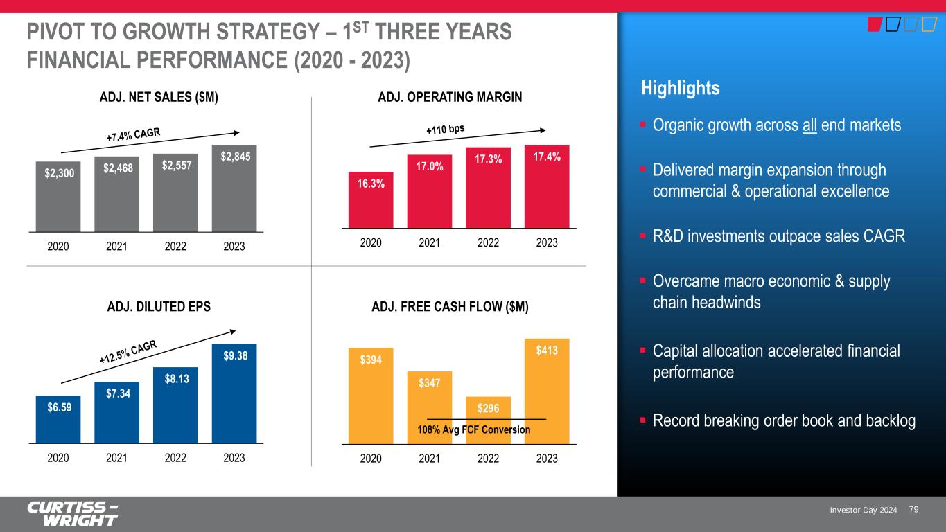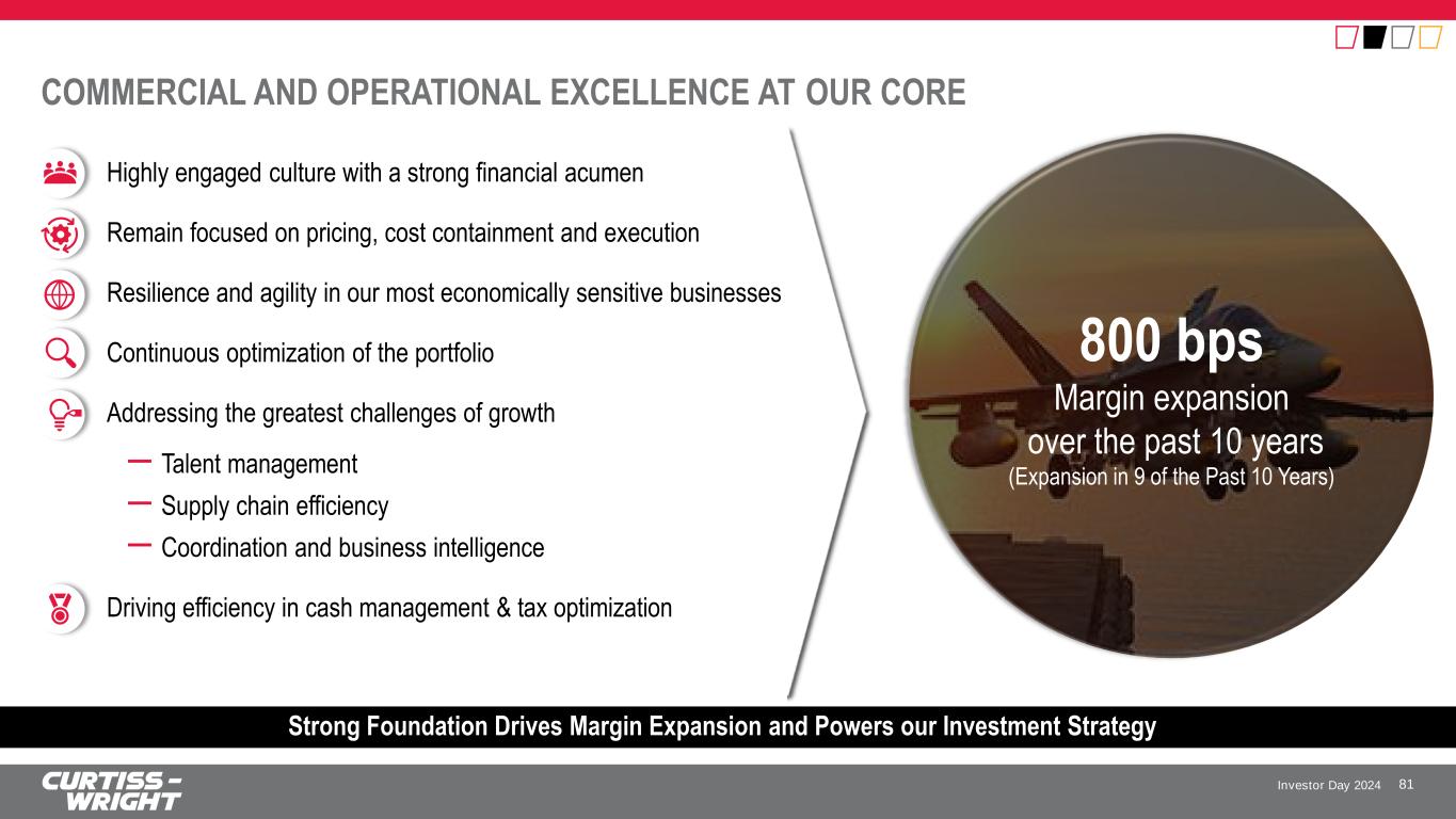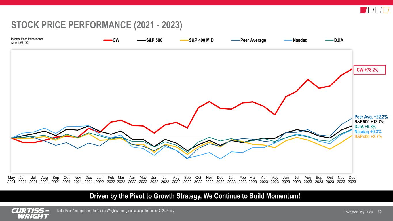 Investor Day 2024 STOCK PRICE PERFORMANCE (2021 - 2023) May 2021 Jun 2021 Jul 2021 Aug 2021 Sep 2021 Oct 2021 Nov 2021 Dec 2021 Jan 2022 Feb 2022 Mar 2022 Apr 2022 May 2022 Jun 2022 Jul 2022 Aug 2022 Sep 2022 Oct 2022 Nov 2022 Dec 2022 Jan 2023 Feb 2023 Mar 2023 Apr 2023 May 2023 Jun 2023 Jul 2023 Aug 2023 Sep 2023 Oct 2023 Nov 2023 Dec 2023 CW S&P 500 S&P 400 MID Peer Average Nasdaq DJIA 80 Driven by the Pivot to Growth Strategy, We Continue to Build Momentum! S&P400 +2.7% S&P500 +13.7% CW +78.2% Peer Avg. +22.2% Nasdaq +9.3% DJIA +9.8% Indexed Price Performance As of 12/31/23 Note: Peer Average refers to Curtiss-Wright’s peer group as reported in our 2024 Proxy