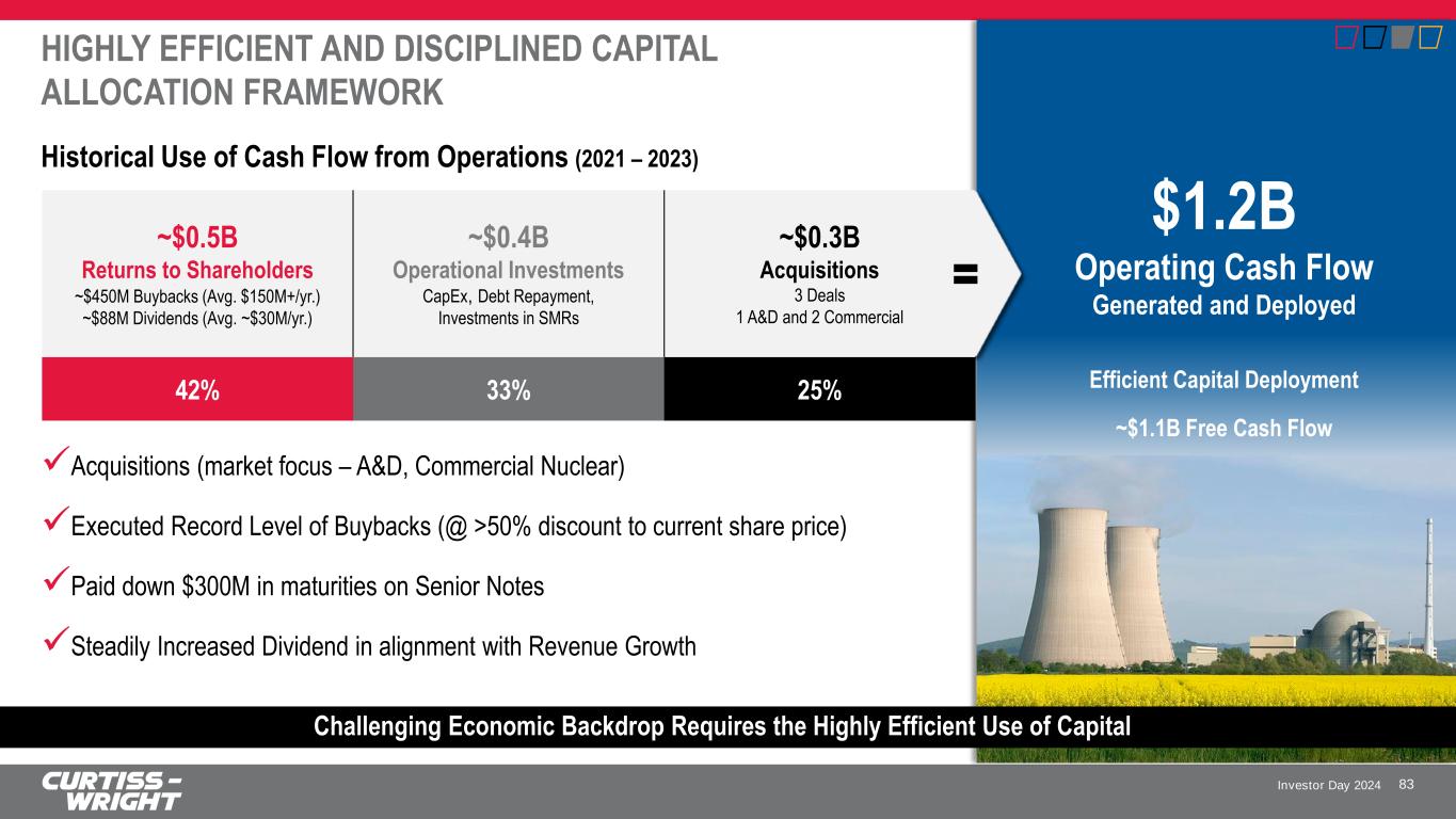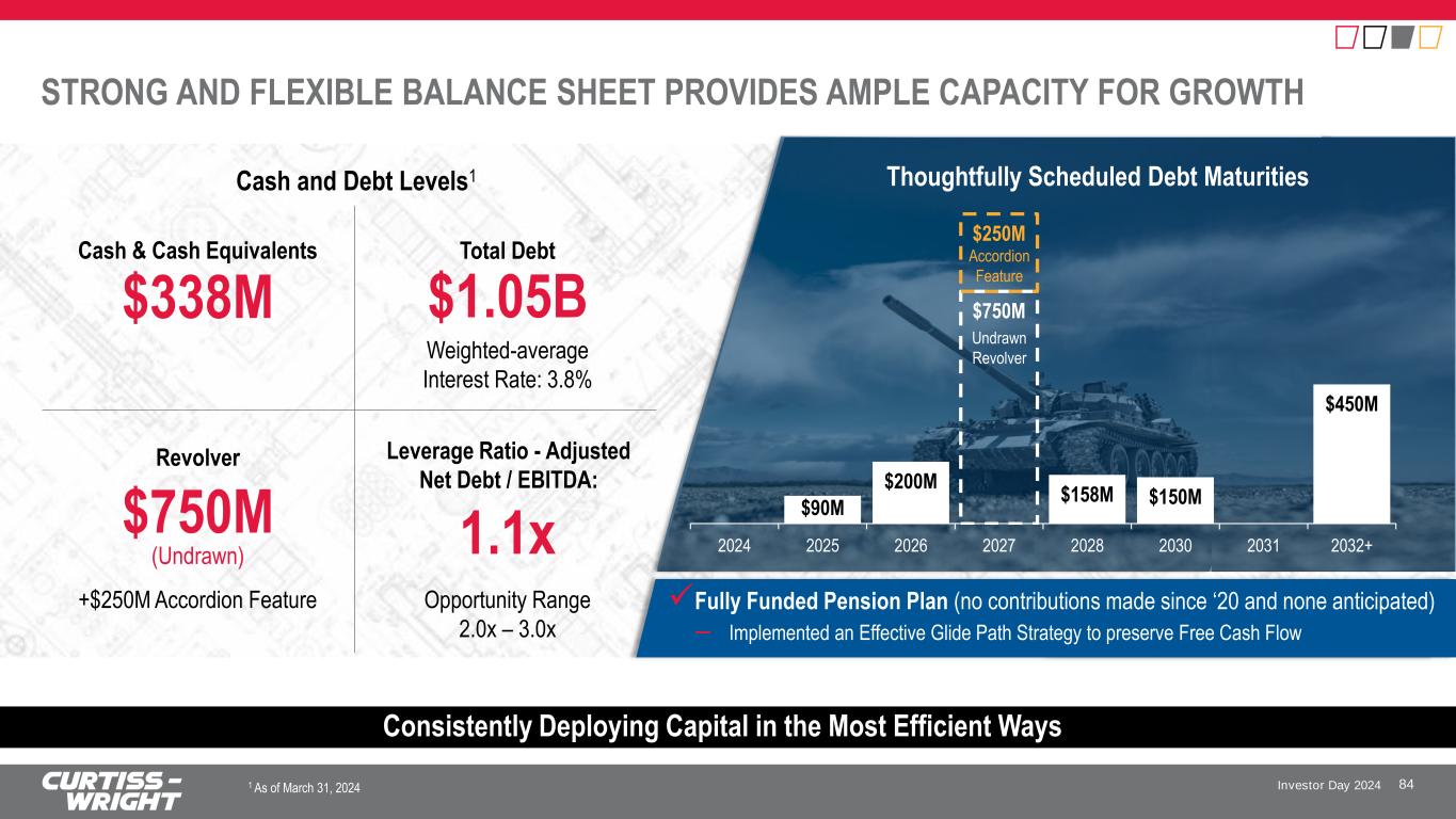 Investor Day 2024 HIGHLY EFFICIENT AND DISCIPLINED CAPITAL ALLOCATION FRAMEWORK 83 Challenging Economic Backdrop Requires the Highly Efficient Use of Capital Historical Use of Cash Flow from Operations (2021 – 2023) $1.2B Operating Cash Flow Generated and Deployed Efficient Capital Deployment ~$1.1B Free Cash Flow ✓Acquisitions (market focus – A&D, Commercial Nuclear) ✓Executed Record Level of Buybacks (@ >50% discount to current share price) ✓Paid down $300M in maturities on Senior Notes ✓Steadily Increased Dividend in alignment with Revenue Growth ~$0.5B Returns to Shareholders ~$450M Buybacks (Avg. $150M+/yr.) ~$88M Dividends (Avg. ~$30M/yr.) ~$0.4B Operational Investments CapEx, Debt Repayment, Investments in SMRs ~$0.3B Acquisitions 3 Deals 1 A&D and 2 Commercial 42% 33% 25%