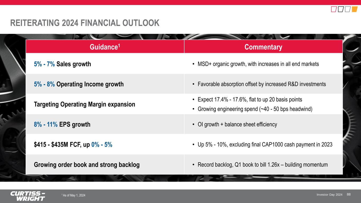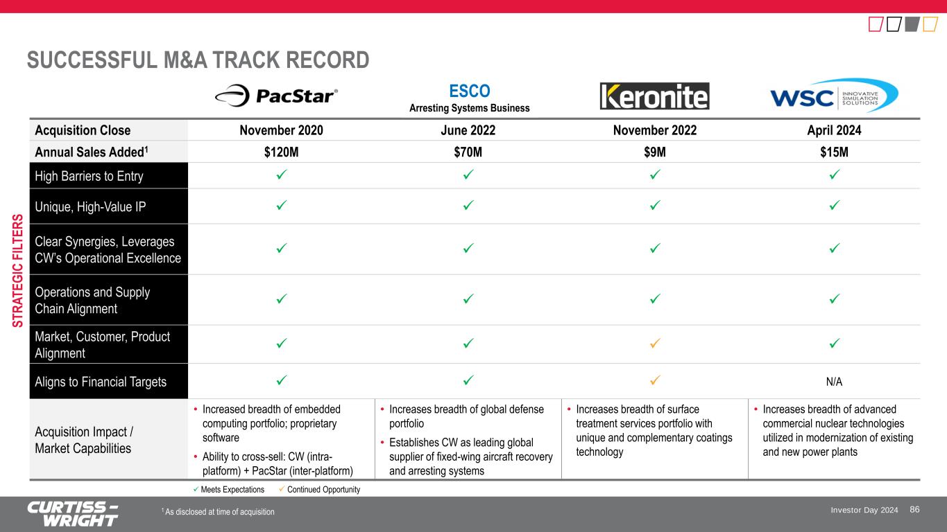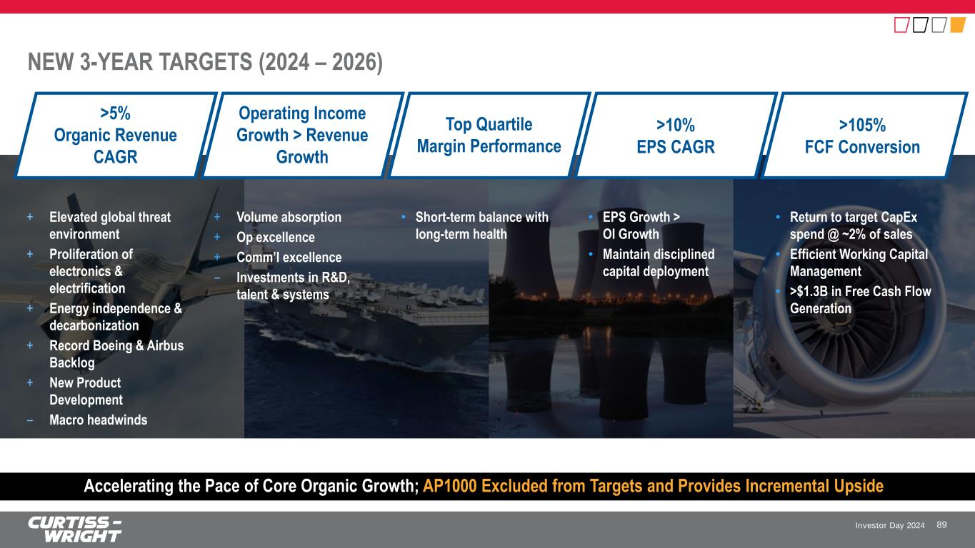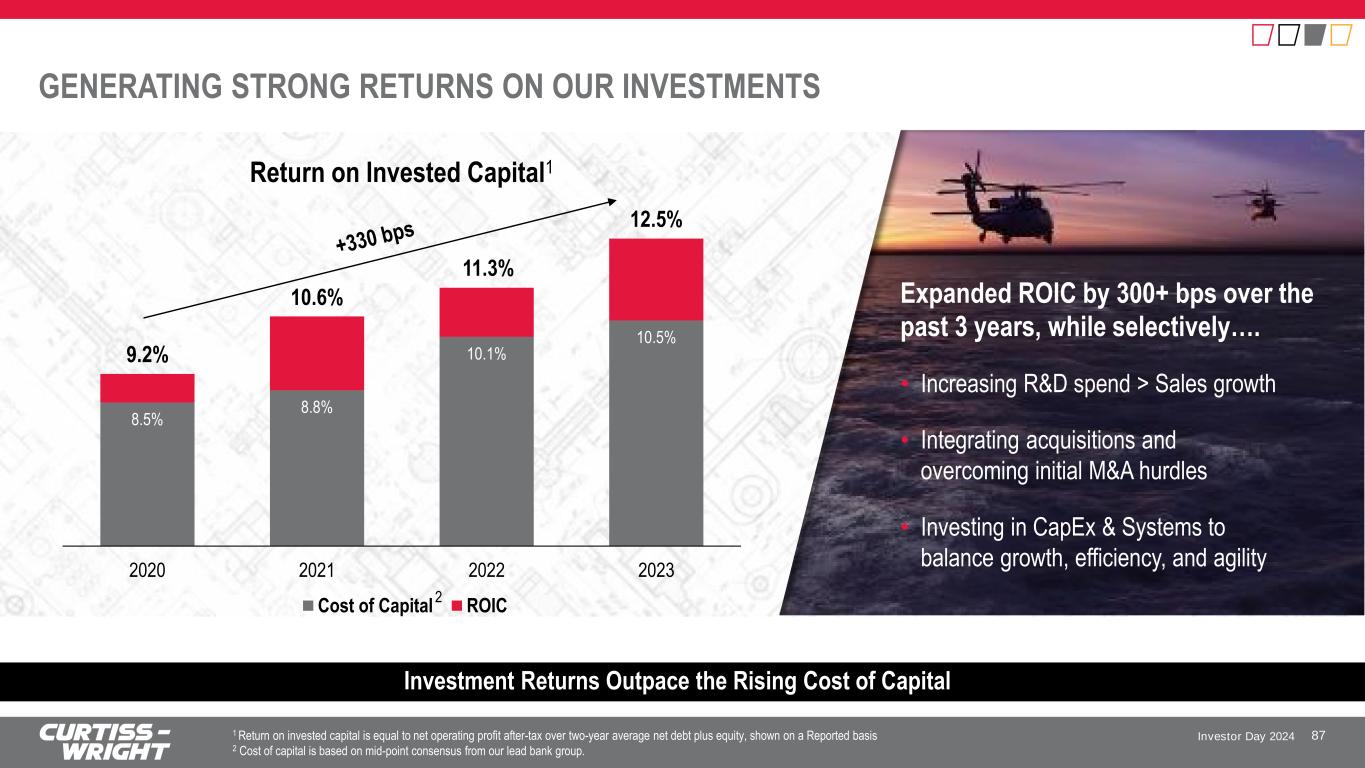 Investor Day 2024 SUCCESSFUL M&A TRACK RECORD 86 Acquisition Close November 2020 June 2022 November 2022 April 2024 Annual Sales Added1 $120M $70M $9M $15M High Barriers to Entry ✓ ✓ ✓ ✓ Unique, High-Value IP ✓ ✓ ✓ ✓ Clear Synergies, Leverages CW’s Operational Excellence ✓ ✓ ✓ ✓ Operations and Supply Chain Alignment ✓ ✓ ✓ ✓ Market, Customer, Product Alignment ✓ ✓ ✓ ✓ Aligns to Financial Targets ✓ ✓ ✓ N/A Acquisition Impact / Market Capabilities • Increased breadth of embedded computing portfolio; proprietary software • Ability to cross-sell: CW (intra- platform) + PacStar (inter-platform) • Increases breadth of global defense portfolio • Establishes CW as leading global supplier of fixed-wing aircraft recovery and arresting systems • Increases breadth of surface treatment services portfolio with unique and complementary coatings technology • Increases breadth of advanced commercial nuclear technologies utilized in modernization of existing and new power plants S T R A T E G IC F IL T E R S ✓ Meets Expectations ✓ Continued Opportunity ESCO Arresting Systems Business 1 As disclosed at time of acquisition
