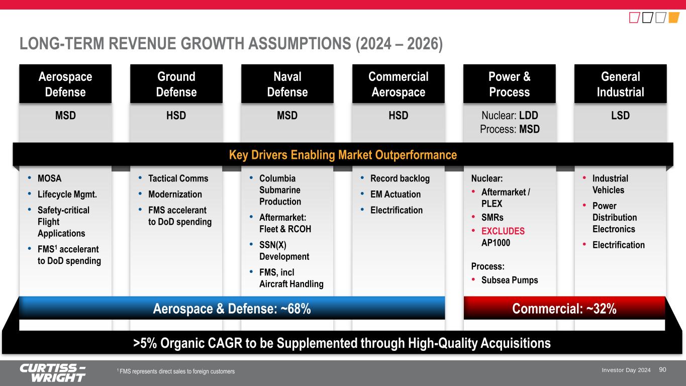 Investor Day 2024 NEW 3-YEAR TARGETS (2024 – 2026) 89 Accelerating the Pace of Core Organic Growth; AP1000 Excluded from Targets and Provides Incremental Upside >5% Organic Revenue CAGR Operating Income Growth > Revenue Growth Top Quartile Margin Performance >10% EPS CAGR >105% FCF Conversion + Elevated global threat environment + Proliferation of electronics & electrification + Energy independence & decarbonization + Record Boeing & Airbus Backlog + New Product Development − Macro headwinds + Volume absorption + Op excellence + Comm’l excellence − Investments in R&D, talent & systems • Short-term balance with long-term health • EPS Growth > OI Growth • Maintain disciplined capital deployment • Return to target CapEx spend @ ~2% of sales • Efficient Working Capital Management • >$1.3B in Free Cash Flow Generation