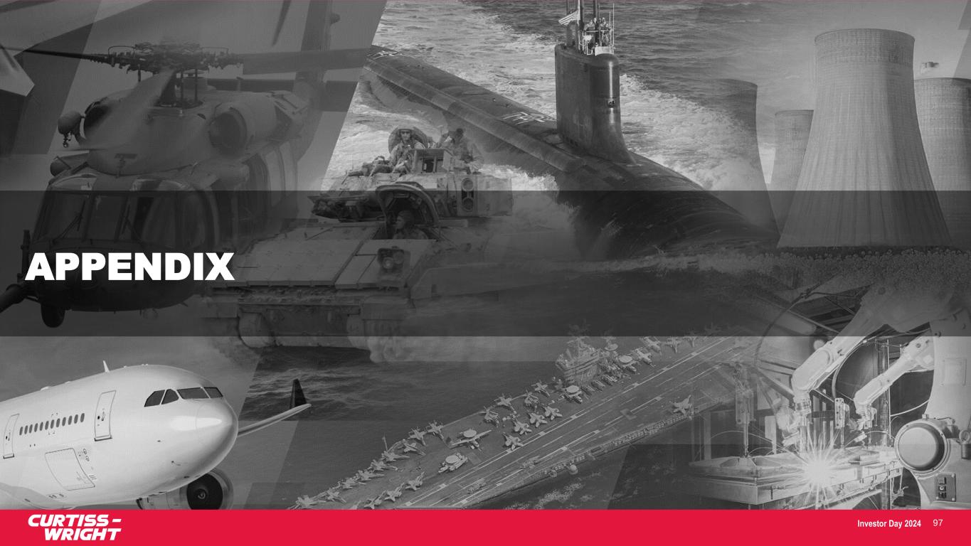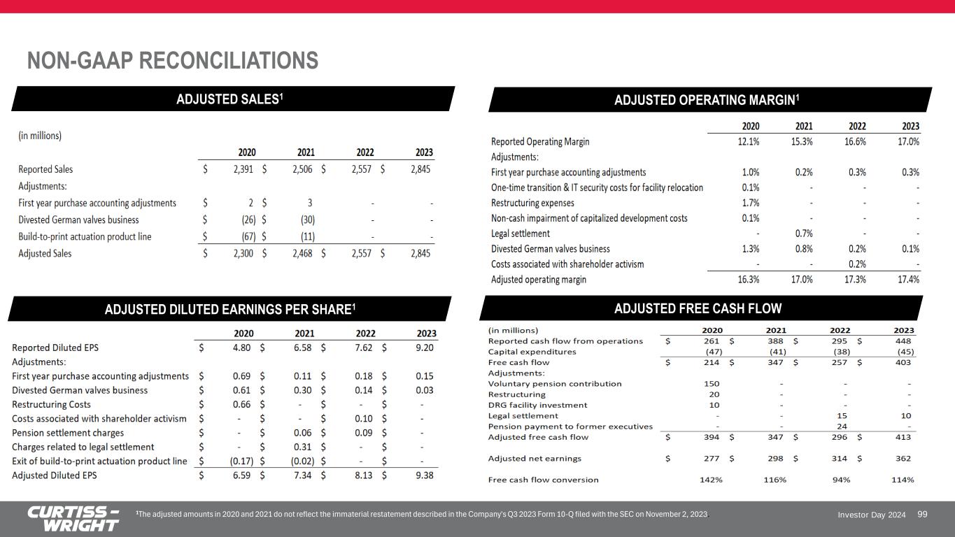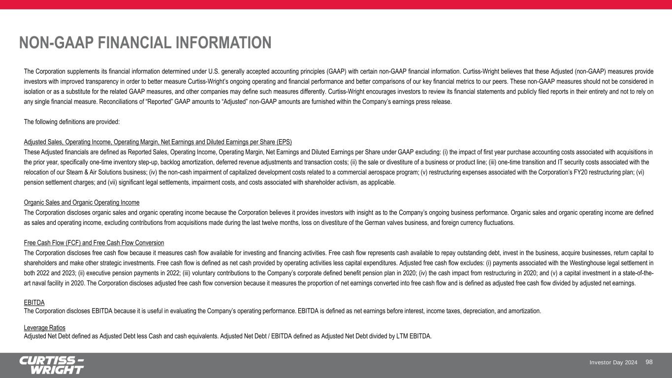 Investor Day 2024 NON-GAAP FINANCIAL INFORMATION 98 The Corporation supplements its financial information determined under U.S. generally accepted accounting principles (GAAP) with certain non-GAAP financial information. Curtiss-Wright believes that these Adjusted (non-GAAP) measures provide investors with improved transparency in order to better measure Curtiss-Wright’s ongoing operating and financial performance and better comparisons of our key financial metrics to our peers. These non-GAAP measures should not be considered in isolation or as a substitute for the related GAAP measures, and other companies may define such measures differently. Curtiss-Wright encourages investors to review its financial statements and publicly filed reports in their entirety and not to rely on any single financial measure. Reconciliations of “Reported” GAAP amounts to “Adjusted” non-GAAP amounts are furnished within the Company’s earnings press release. The following definitions are provided: Adjusted Sales, Operating Income, Operating Margin, Net Earnings and Diluted Earnings per Share (EPS) These Adjusted financials are defined as Reported Sales, Operating Income, Operating Margin, Net Earnings and Diluted Earnings per Share under GAAP excluding: (i) the impact of first year purchase accounting costs associated with acquisitions in the prior year, specifically one-time inventory step-up, backlog amortization, deferred revenue adjustments and transaction costs; (ii) the sale or divestiture of a business or product line; (iii) one-time transition and IT security costs associated with the relocation of our Steam & Air Solutions business; (iv) the non-cash impairment of capitalized development costs related to a commercial aerospace program; (v) restructuring expenses associated with the Corporation’s FY20 restructuring plan; (vi) pension settlement charges; and (vii) significant legal settlements, impairment costs, and costs associated with shareholder activism, as applicable. Organic Sales and Organic Operating Income The Corporation discloses organic sales and organic operating income because the Corporation believes it provides investors with insight as to the Company’s ongoing business performance. Organic sales and organic operating income are defined as sales and operating income, excluding contributions from acquisitions made during the last twelve months, loss on divestiture of the German valves business, and foreign currency fluctuations. Free Cash Flow (FCF) and Free Cash Flow Conversion The Corporation discloses free cash flow because it measures cash flow available for investing and financing activities. Free cash flow represents cash available to repay outstanding debt, invest in the business, acquire businesses, return capital to shareholders and make other strategic investments. Free cash flow is defined as net cash provided by operating activities less capital expenditures. Adjusted free cash flow excludes: (i) payments associated with the Westinghouse legal settlement in both 2022 and 2023; (ii) executive pension payments in 2022; (iii) voluntary contributions to the Company’s corporate defined benefit pension plan in 2020; (iv) the cash impact from restructuring in 2020; and (v) a capital investment in a state-of-the- art naval facility in 2020. The Corporation discloses adjusted free cash flow conversion because it measures the proportion of net earnings converted into free cash flow and is defined as adjusted free cash flow divided by adjusted net earnings. EBITDA The Corporation discloses EBITDA because it is useful in evaluating the Company’s operating performance. EBITDA is defined as net earnings before interest, income taxes, depreciation, and amortization. Leverage Ratios Adjusted Net Debt defined as Adjusted Debt less Cash and cash equivalents. Adjusted Net Debt / EBITDA defined as Adjusted Net Debt divided by LTM EBITDA.