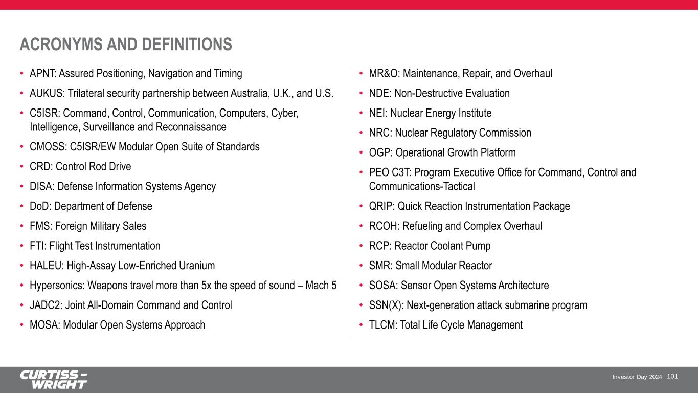 Investor Day 2024 ACRONYMS AND DEFINITIONS • APNT: Assured Positioning, Navigation and Timing • AUKUS: Trilateral security partnership between Australia, U.K., and U.S. • C5ISR: Command, Control, Communication, Computers, Cyber, Intelligence, Surveillance and Reconnaissance • CMOSS: C5ISR/EW Modular Open Suite of Standards • CRD: Control Rod Drive • DISA: Defense Information Systems Agency • DoD: Department of Defense • FMS: Foreign Military Sales • FTI: Flight Test Instrumentation • HALEU: High-Assay Low-Enriched Uranium • Hypersonics: Weapons travel more than 5x the speed of sound – Mach 5 • JADC2: Joint All-Domain Command and Control • MOSA: Modular Open Systems Approach 101 • MR&O: Maintenance, Repair, and Overhaul • NDE: Non-Destructive Evaluation • NEI: Nuclear Energy Institute • NRC: Nuclear Regulatory Commission • OGP: Operational Growth Platform • PEO C3T: Program Executive Office for Command, Control and Communications-Tactical • QRIP: Quick Reaction Instrumentation Package • RCOH: Refueling and Complex Overhaul • RCP: Reactor Coolant Pump • SMR: Small Modular Reactor • SOSA: Sensor Open Systems Architecture • SSN(X): Next-generation attack submarine program • TLCM: Total Life Cycle Management