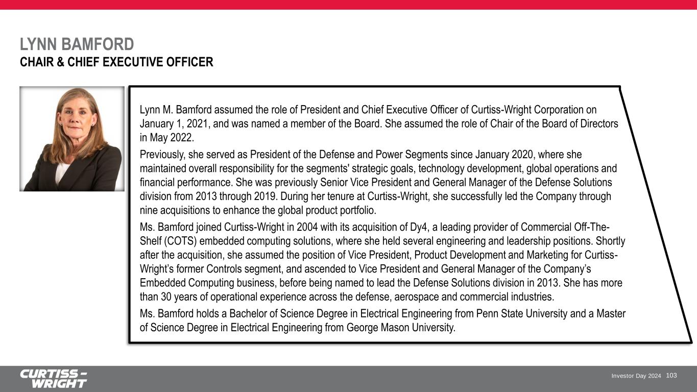 Investor Day 2024 LYNN BAMFORD 103 CHAIR & CHIEF EXECUTIVE OFFICER Lynn M. Bamford assumed the role of President and Chief Executive Officer of Curtiss-Wright Corporation on January 1, 2021, and was named a member of the Board. She assumed the role of Chair of the Board of Directors in May 2022. Previously, she served as President of the Defense and Power Segments since January 2020, where she maintained overall responsibility for the segments' strategic goals, technology development, global operations and financial performance. She was previously Senior Vice President and General Manager of the Defense Solutions division from 2013 through 2019. During her tenure at Curtiss-Wright, she successfully led the Company through nine acquisitions to enhance the global product portfolio. Ms. Bamford joined Curtiss-Wright in 2004 with its acquisition of Dy4, a leading provider of Commercial Off-The- Shelf (COTS) embedded computing solutions, where she held several engineering and leadership positions. Shortly after the acquisition, she assumed the position of Vice President, Product Development and Marketing for Curtiss- Wright’s former Controls segment, and ascended to Vice President and General Manager of the Company’s Embedded Computing business, before being named to lead the Defense Solutions division in 2013. She has more than 30 years of operational experience across the defense, aerospace and commercial industries. Ms. Bamford holds a Bachelor of Science Degree in Electrical Engineering from Penn State University and a Master of Science Degree in Electrical Engineering from George Mason University.