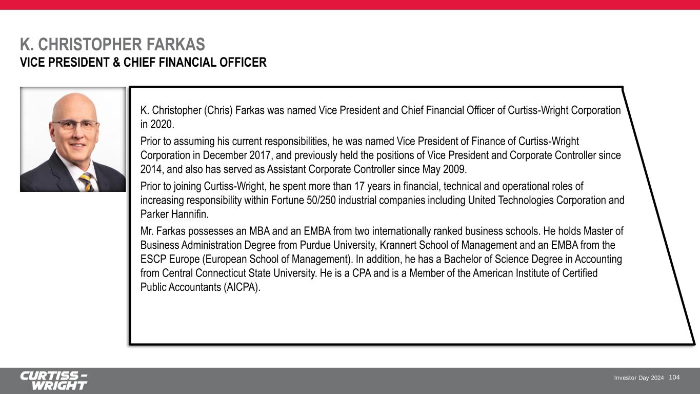 Investor Day 2024 K. CHRISTOPHER FARKAS 104 VICE PRESIDENT & CHIEF FINANCIAL OFFICER K. Christopher (Chris) Farkas was named Vice President and Chief Financial Officer of Curtiss-Wright Corporation in 2020. Prior to assuming his current responsibilities, he was named Vice President of Finance of Curtiss-Wright Corporation in December 2017, and previously held the positions of Vice President and Corporate Controller since 2014, and also has served as Assistant Corporate Controller since May 2009. Prior to joining Curtiss-Wright, he spent more than 17 years in financial, technical and operational roles of increasing responsibility within Fortune 50/250 industrial companies including United Technologies Corporation and Parker Hannifin. Mr. Farkas possesses an MBA and an EMBA from two internationally ranked business schools. He holds Master of Business Administration Degree from Purdue University, Krannert School of Management and an EMBA from the ESCP Europe (European School of Management). In addition, he has a Bachelor of Science Degree in Accounting from Central Connecticut State University. He is a CPA and is a Member of the American Institute of Certified Public Accountants (AICPA).