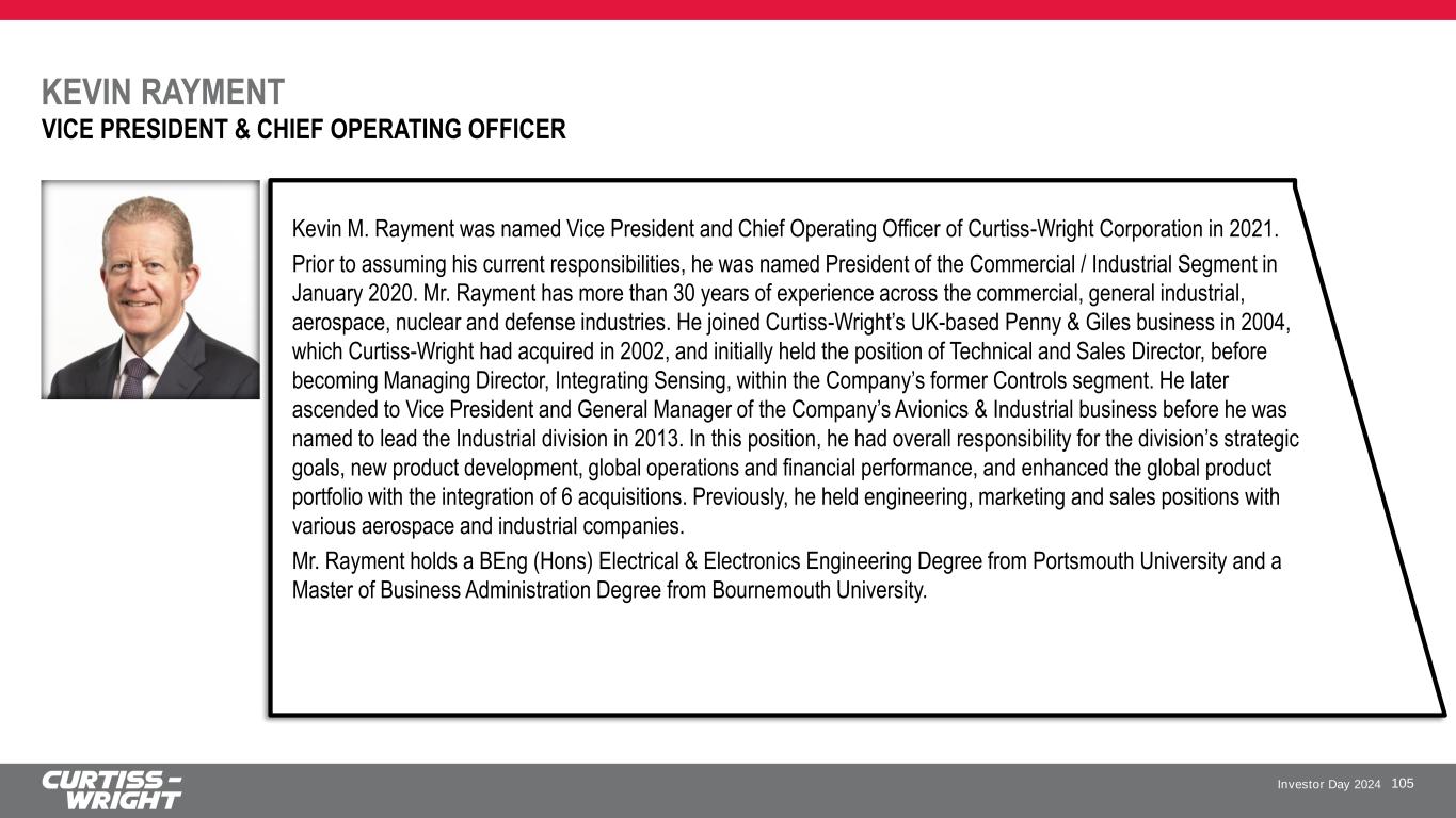 Investor Day 2024 KEVIN RAYMENT 105 VICE PRESIDENT & CHIEF OPERATING OFFICER Kevin M. Rayment was named Vice President and Chief Operating Officer of Curtiss-Wright Corporation in 2021. Prior to assuming his current responsibilities, he was named President of the Commercial / Industrial Segment in January 2020. Mr. Rayment has more than 30 years of experience across the commercial, general industrial, aerospace, nuclear and defense industries. He joined Curtiss-Wright’s UK-based Penny & Giles business in 2004, which Curtiss-Wright had acquired in 2002, and initially held the position of Technical and Sales Director, before becoming Managing Director, Integrating Sensing, within the Company’s former Controls segment. He later ascended to Vice President and General Manager of the Company’s Avionics & Industrial business before he was named to lead the Industrial division in 2013. In this position, he had overall responsibility for the division’s strategic goals, new product development, global operations and financial performance, and enhanced the global product portfolio with the integration of 6 acquisitions. Previously, he held engineering, marketing and sales positions with various aerospace and industrial companies. Mr. Rayment holds a BEng (Hons) Electrical & Electronics Engineering Degree from Portsmouth University and a Master of Business Administration Degree from Bournemouth University.