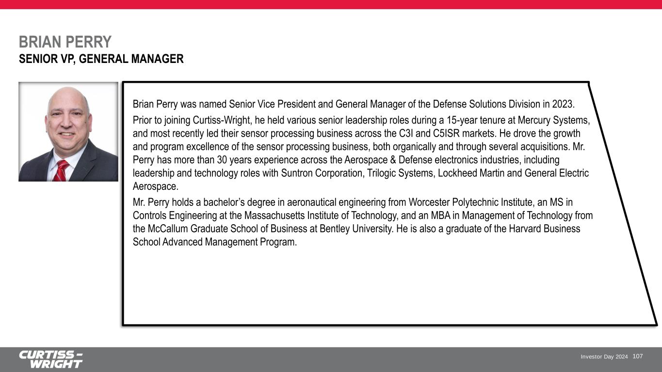 Investor Day 2024 BRIAN PERRY 107 SENIOR VP, GENERAL MANAGER Brian Perry was named Senior Vice President and General Manager of the Defense Solutions Division in 2023. Prior to joining Curtiss-Wright, he held various senior leadership roles during a 15-year tenure at Mercury Systems, and most recently led their sensor processing business across the C3I and C5ISR markets. He drove the growth and program excellence of the sensor processing business, both organically and through several acquisitions. Mr. Perry has more than 30 years experience across the Aerospace & Defense electronics industries, including leadership and technology roles with Suntron Corporation, Trilogic Systems, Lockheed Martin and General Electric Aerospace. Mr. Perry holds a bachelor’s degree in aeronautical engineering from Worcester Polytechnic Institute, an MS in Controls Engineering at the Massachusetts Institute of Technology, and an MBA in Management of Technology from the McCallum Graduate School of Business at Bentley University. He is also a graduate of the Harvard Business School Advanced Management Program.